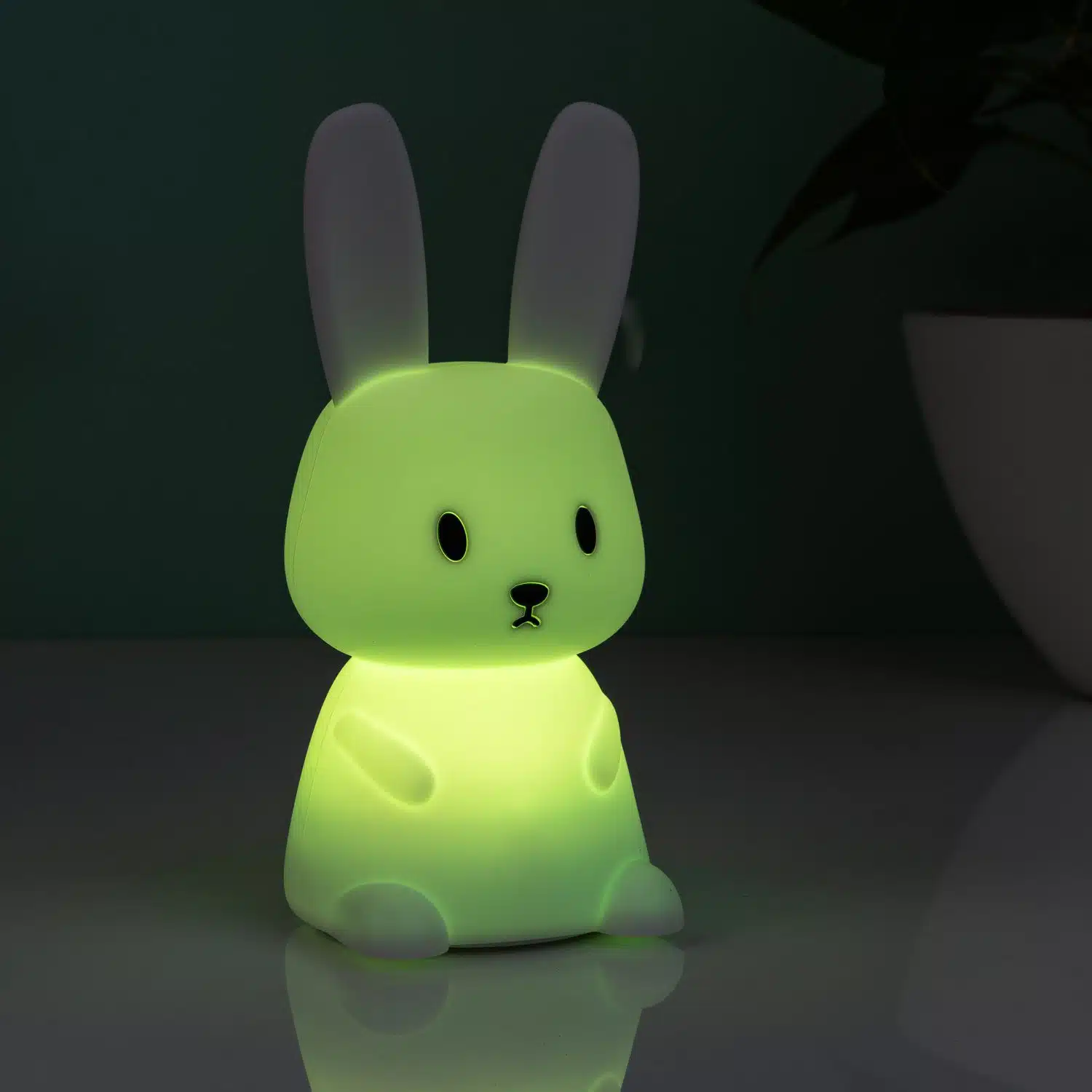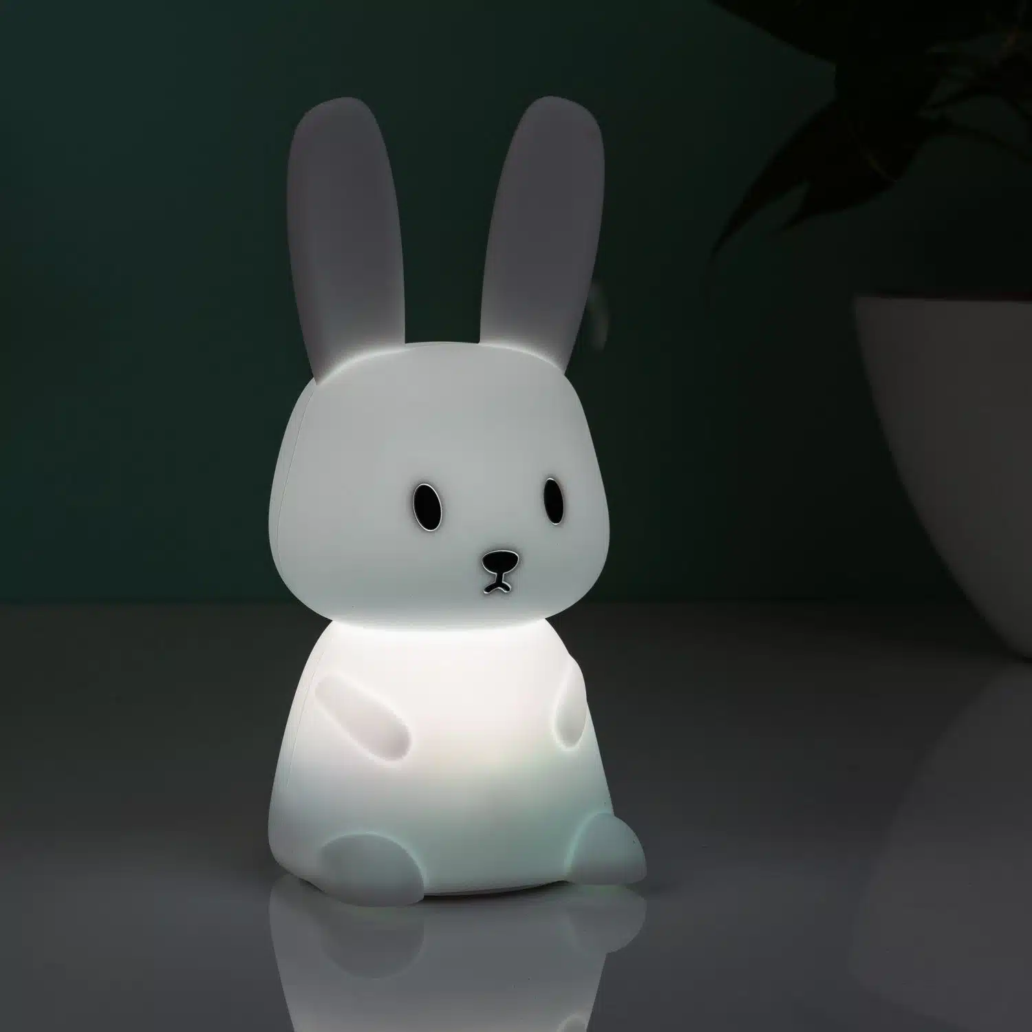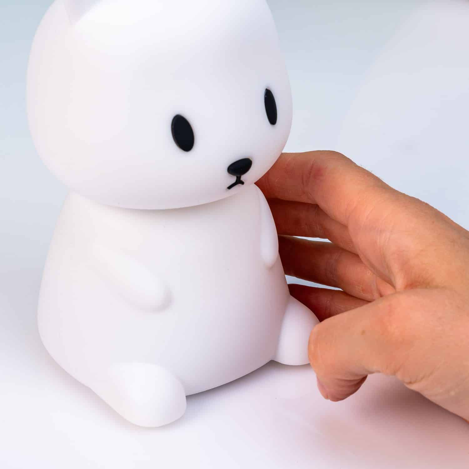Van het Konijn nachtlampje van Winkee wordt elk kindje blij. Dit schattige konijntje houdt de wacht. Het siliconen nachtlampje geeft niet alleen warmwit licht, maar ook in heel veel andere kleuren, zoals groen, blauw, paars en rood. Heb je een kleur gevonden die je mooi vindt, dan kun je deze vastzetten door het konijn aan te raken. Met dit konijntje op het nachtkastje valt je kleintje voortaan vast heerlijk in slaap.