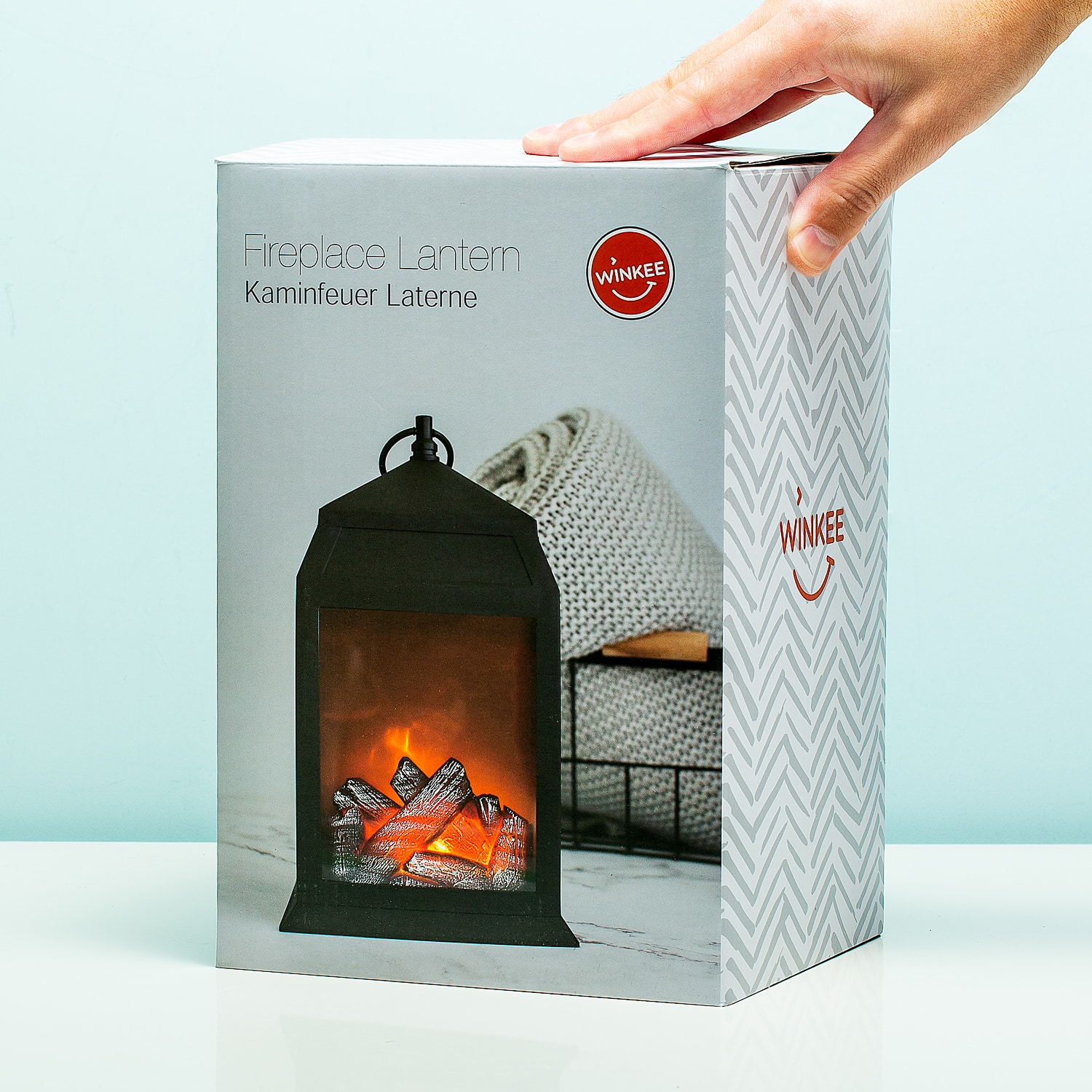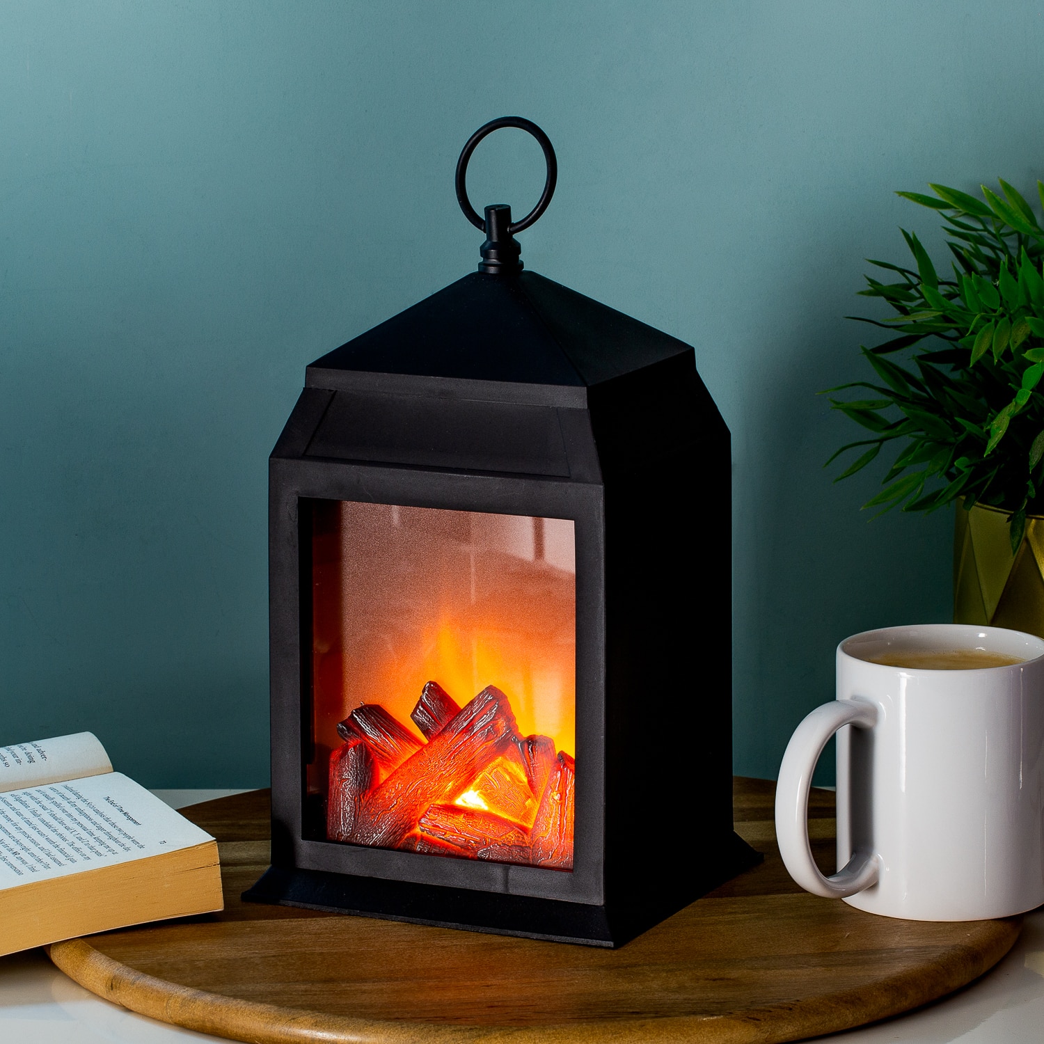Lantaarn die licht geeft, waardoor het lijkt alsof het hout brandt.