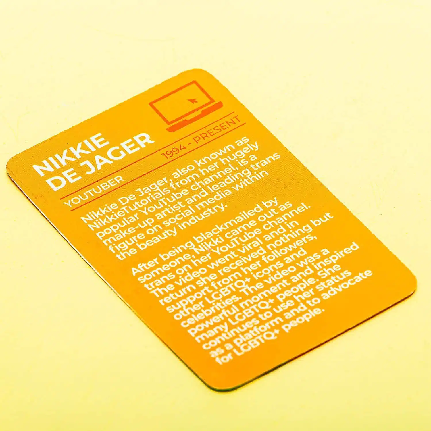 Juno Dawson, Cher en onze eigen Nikkie de Jager: stuk voor stuk iconen uit de LGBTQ+ community. Lees meer over je voorbeelden op de LGBTQ+ Icons kaarten van Gift Republic. Leerzaam voor jou én voor mensen in je omgeving.