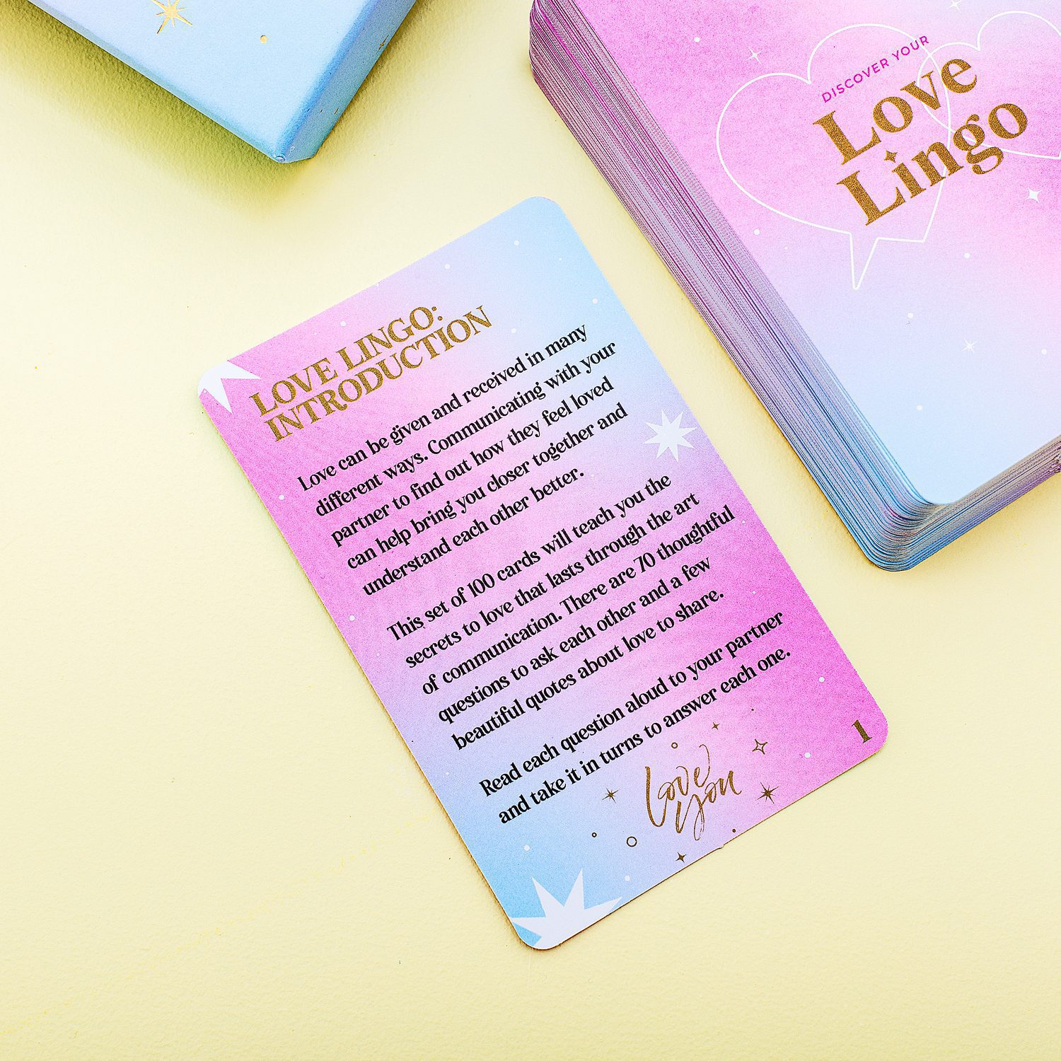Is jouw partner geen prater? Met de Love Lingo kaarten van Gift Republic kun je op een speelse manier hem of haar toch overtuigen om over jullie relatie te praten. Deze set van honderd kaarten bevat mooie quotes over de liefde en zeventig vragen over jullie en jullie relatie. Zoals bijvoorbeeld: How would you describe our relationship in three words?