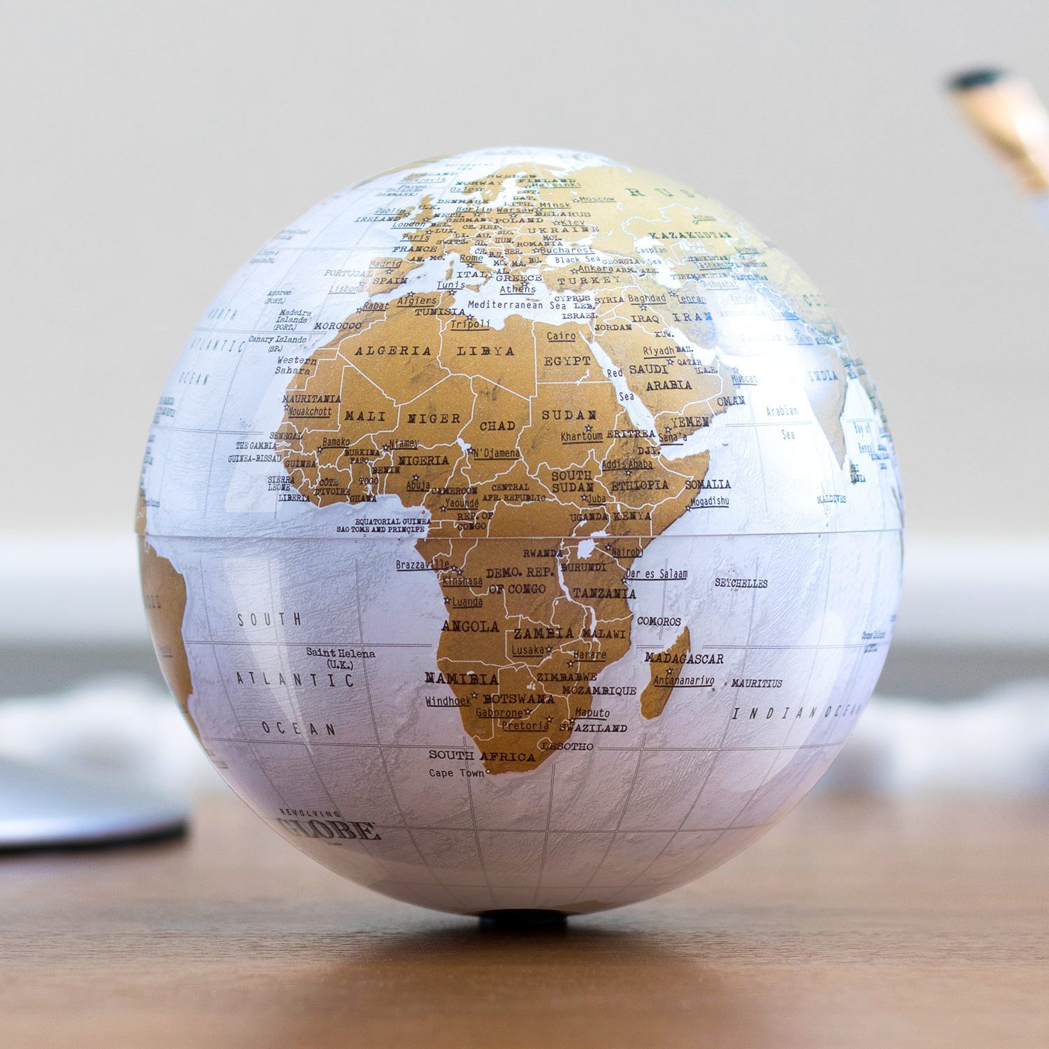 Hoe leer je je kinderen (of leerlingen) dat de wereld echt draait? Nou, met de Draaiende wereldbol van Luckies bijvoorbeeld. Deze unieke wereldbol heeft een onzichtbare basis, waar hij op draait. In veertien seconden kun jij de wereld rond. De globe is wit en heeft een goudbruine bedrukking. Hij werkt op één AA-batterij, dus je kunt hem overal neerzetten. Leuk voor in de klas, op kantoor of voor in de kinderkamer.