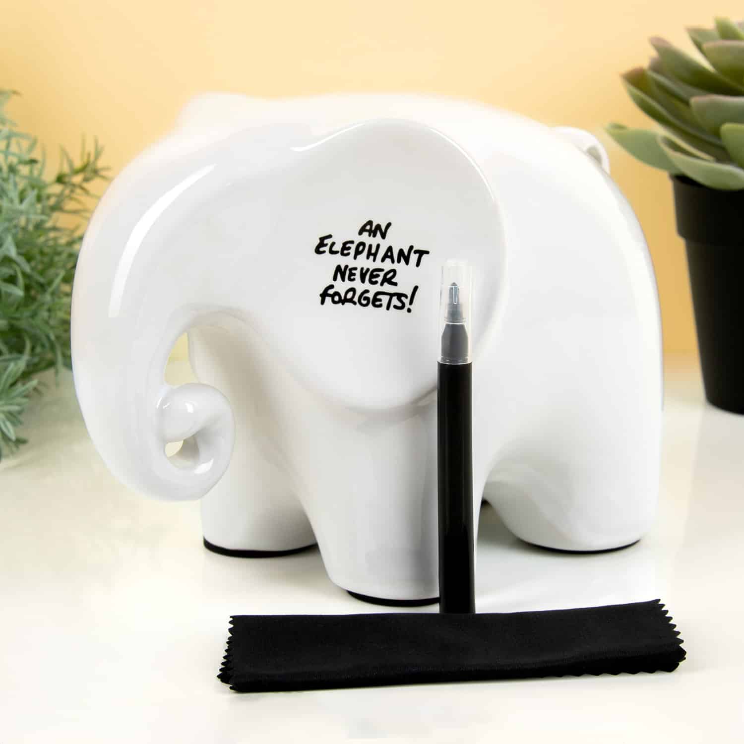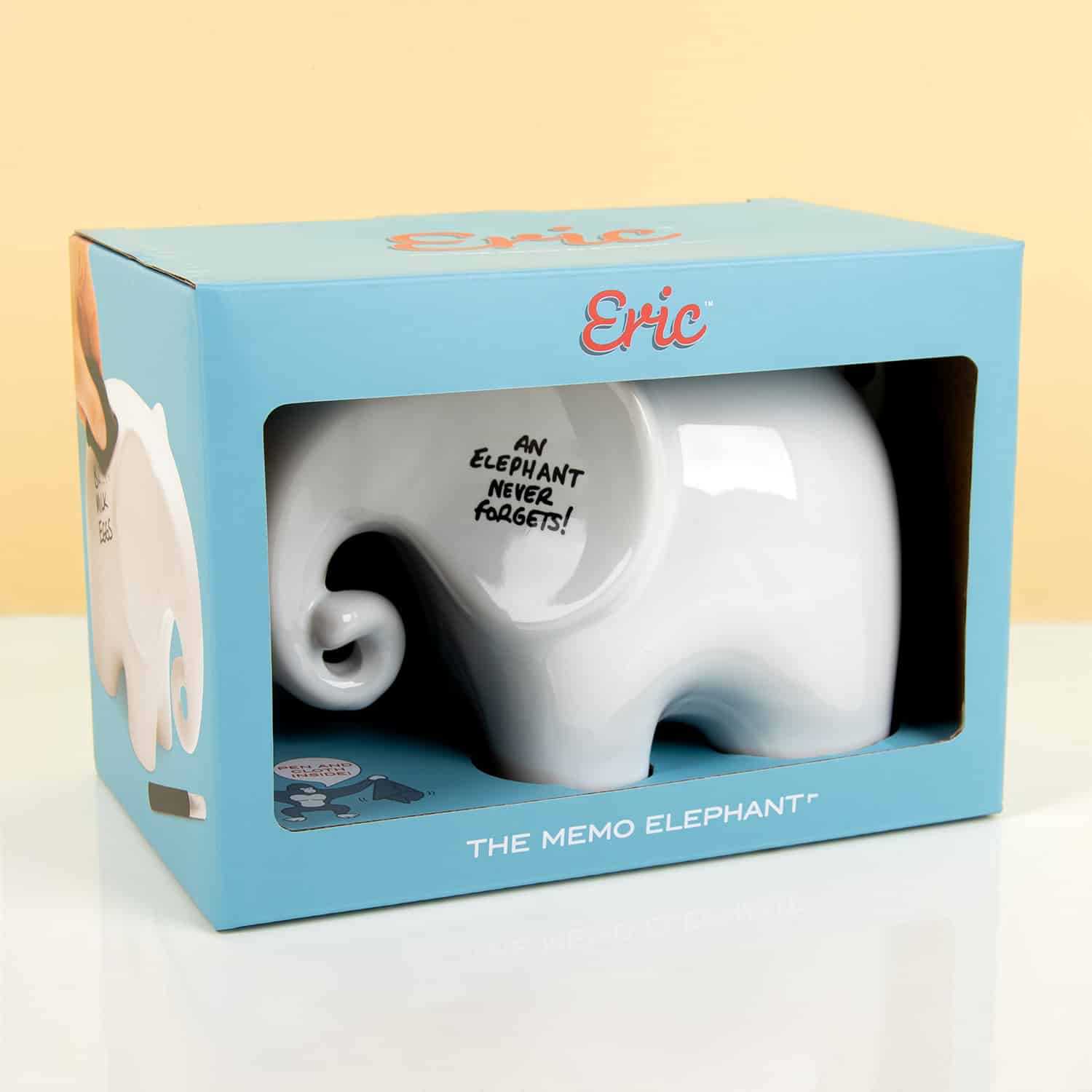Ontmoet Eric, de Memo olifant met stift van Luckies. Deze handige kleine vriend heeft een olifantengeheugen. En daar laat hij jou ook gebruik van maken. De olifant is namelijk een 3D memobord. Hij is handig te beschrijven met de bijgeleverde stift, zodat je nooit meer wat vergeet. Boodschappen, een taak voor je geliefde: Eric onthoudt alles. De olifant heeft een uitwisbare stift in zijn slurf en onder zijn staart zit een handig doekje waarmee je alles weer kan wissen. En het mooiste van alles: Eric is niet gemaakt van plastic, maar van ultraglad keramiek. Hij is dus niet alleen handig, maar ook heel erg mooi.