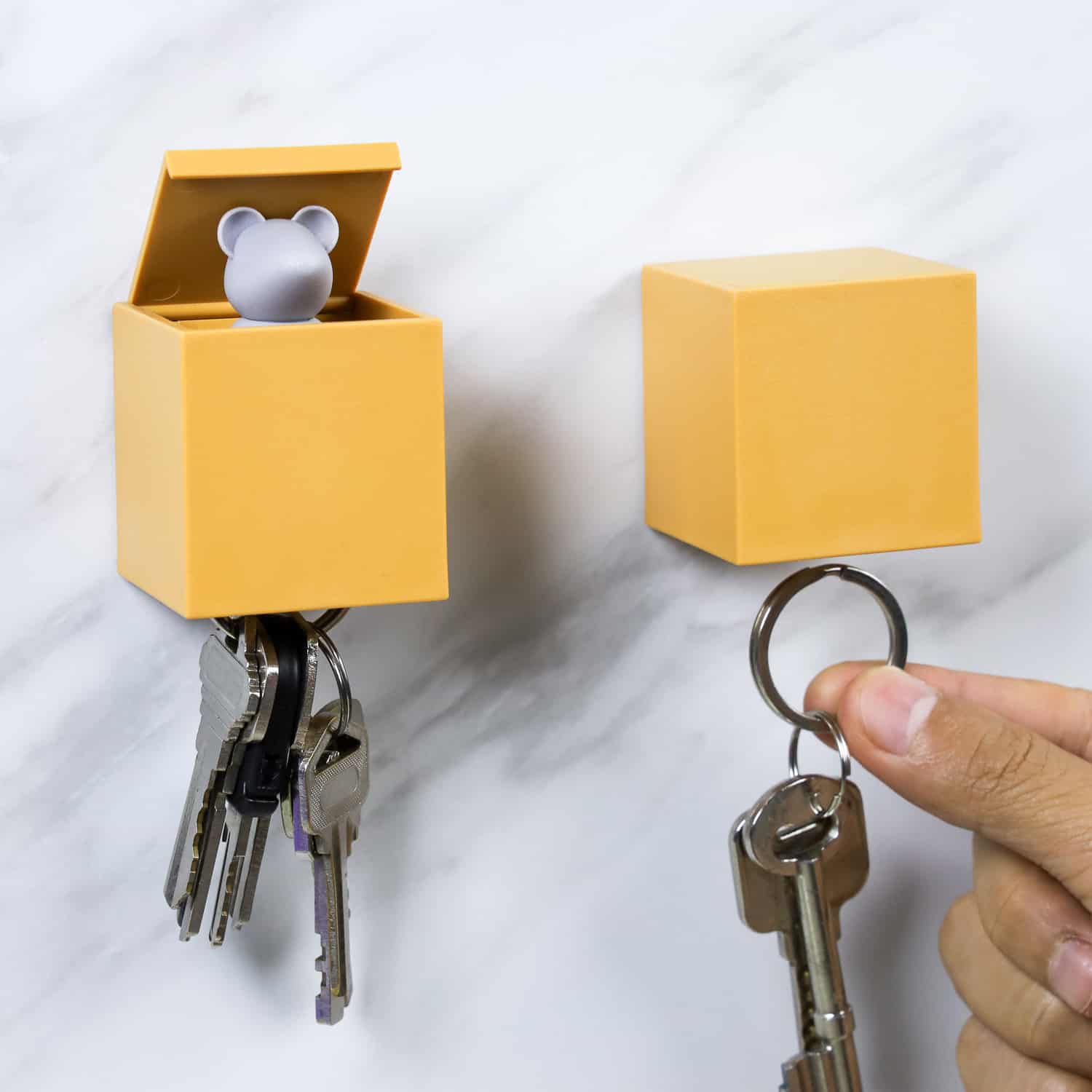 De Lucky Mouse Key Holder van Qualy is met dubbelzijdige tape gemakkelijk aan de muur te bevestigen.