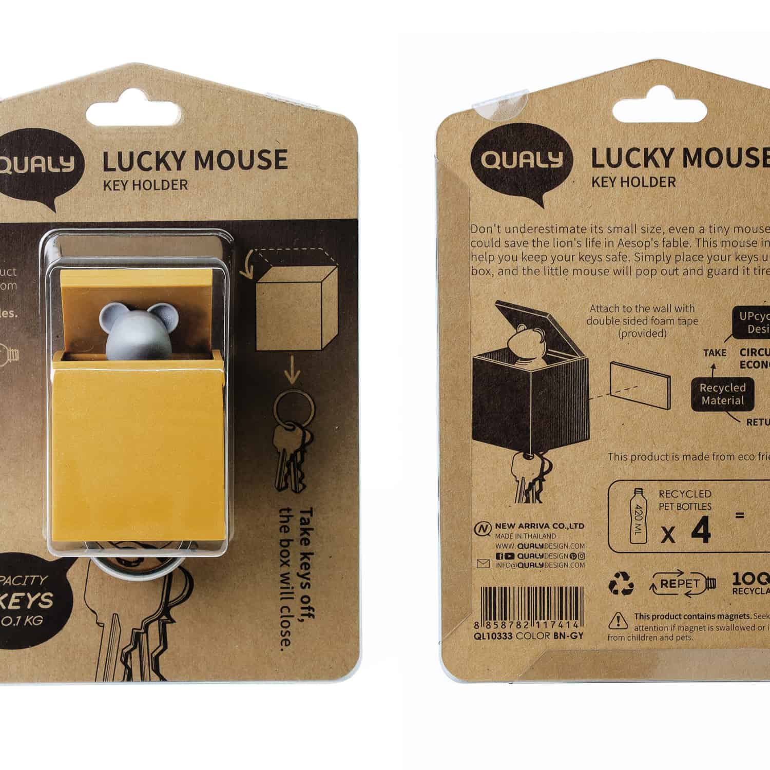 Een guitige sleutelhouder met een grijze muis in een bruin doosje. Zodra jij je sleutels aan de Lucky Mouse ophangt, steekt hij direct nieuwsgierig zijn kopje uit de doos.