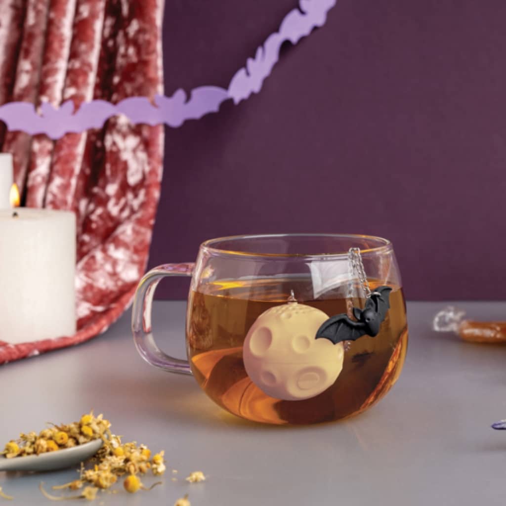 Maak kennis met de Maan en vleermuis tea infuser van Ototo: voor wanneer je je thee net zo mysterieus wilt als je Netflix-avond! Deze infuser heeft de vorm van een volle maan, met een vleermuis die dramatisch aan de rand van je glas hangt. Vul de maan met losse thee, hang hem in je kopje en geniet van je magische theemoment terwijl de vleermuis de wacht houdt. Perfect voor spooky season… of eigenlijk het hele jaar door als je van gothic vibes houdt. Een mystiek cadeau voor theeliefhebbers met een donkere kant!