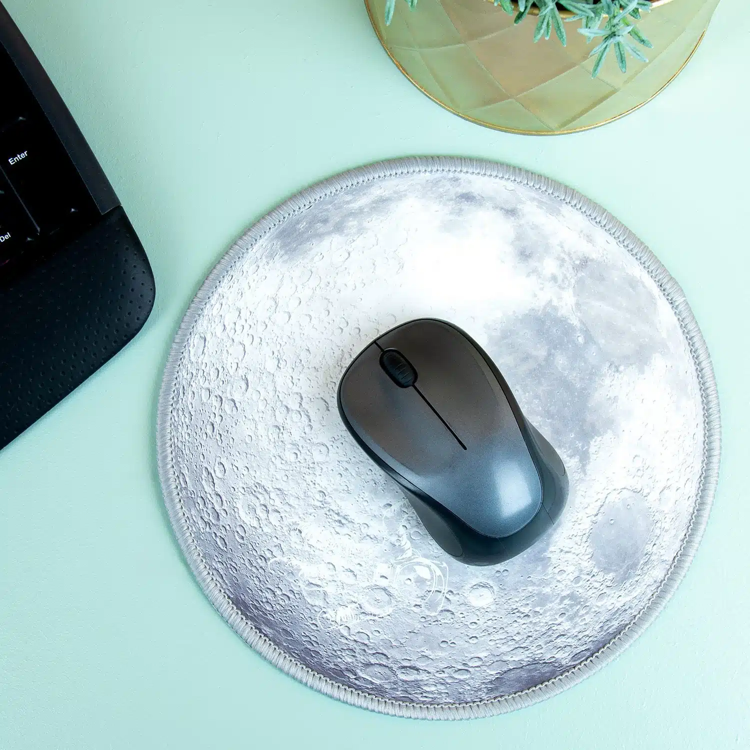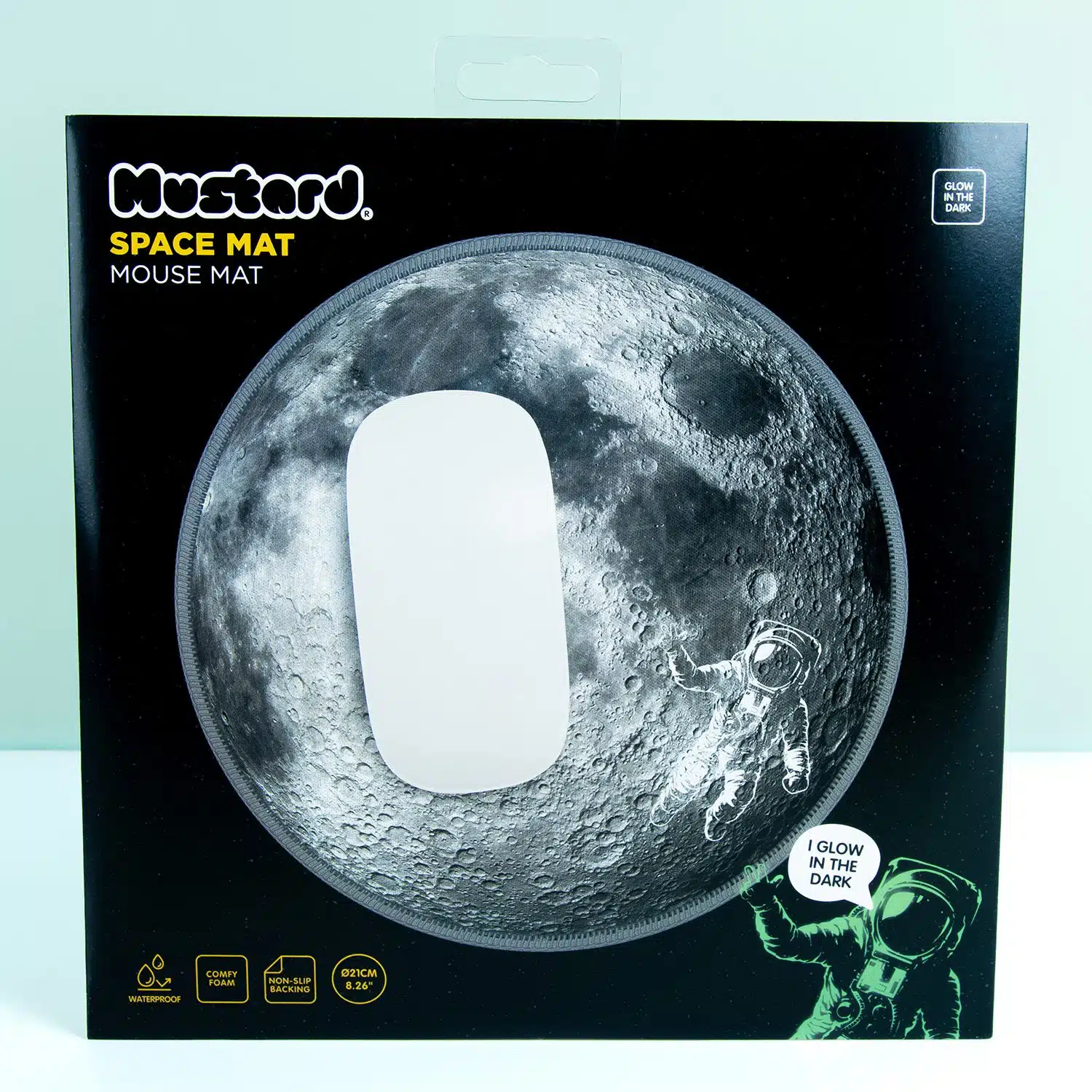 Muismatten zien er vaak een beetje saai uit, maar wij hebben er één die echt cool is: de Maan muismat van Mustard. Deze unieke muismat ziet eruit als de maan! Maar dat is niet het enige: er zweeft ook een glow in the dark astronaut voor de maan. Als deze is opgeladen door zonlicht of het licht van een bureaulampje, dan geeft hij licht in het donker.