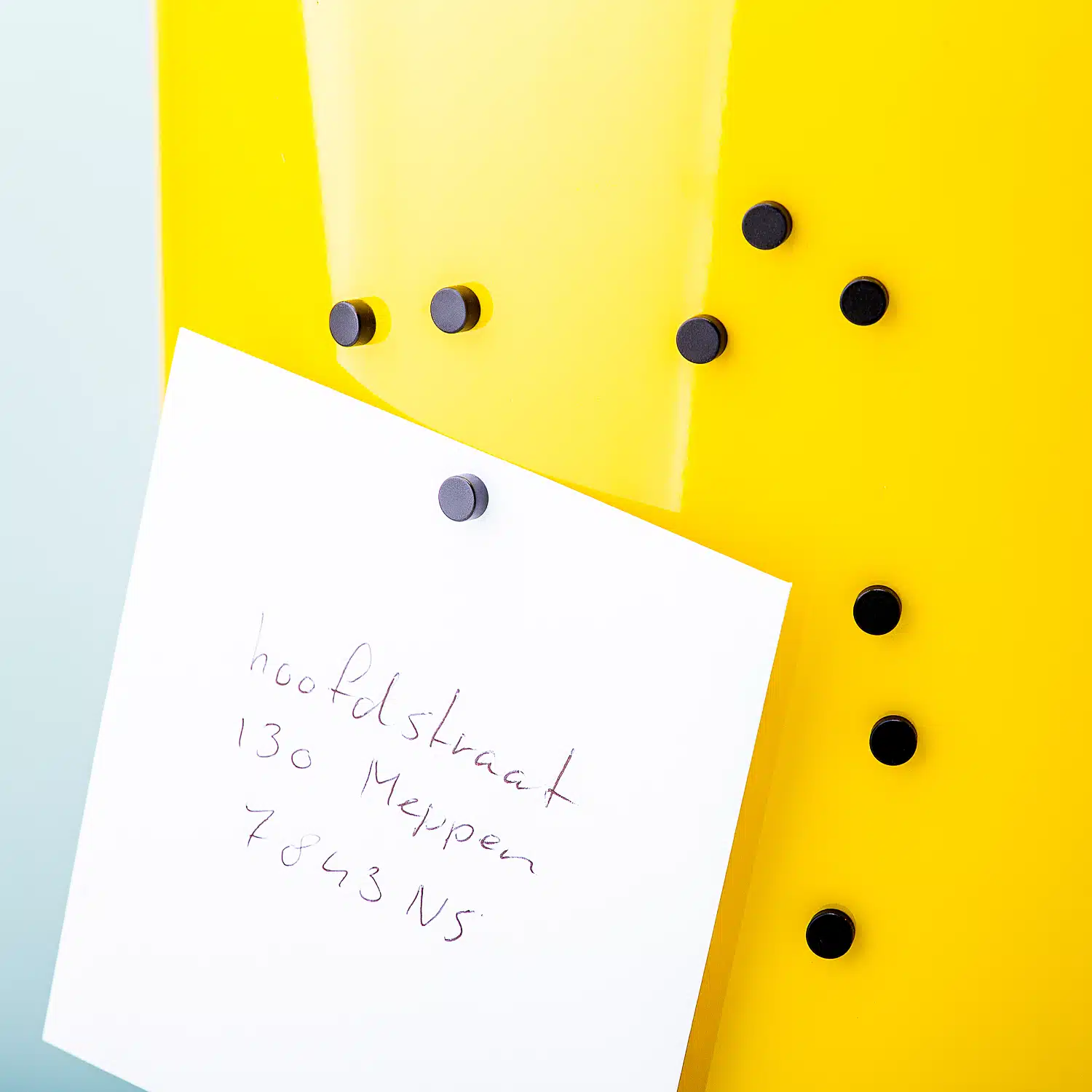 Set van 10 kleine, ronde magneten in een zwarte kleur. Kleine, maar heel krachtige magneten om dingen mee op te hangen.