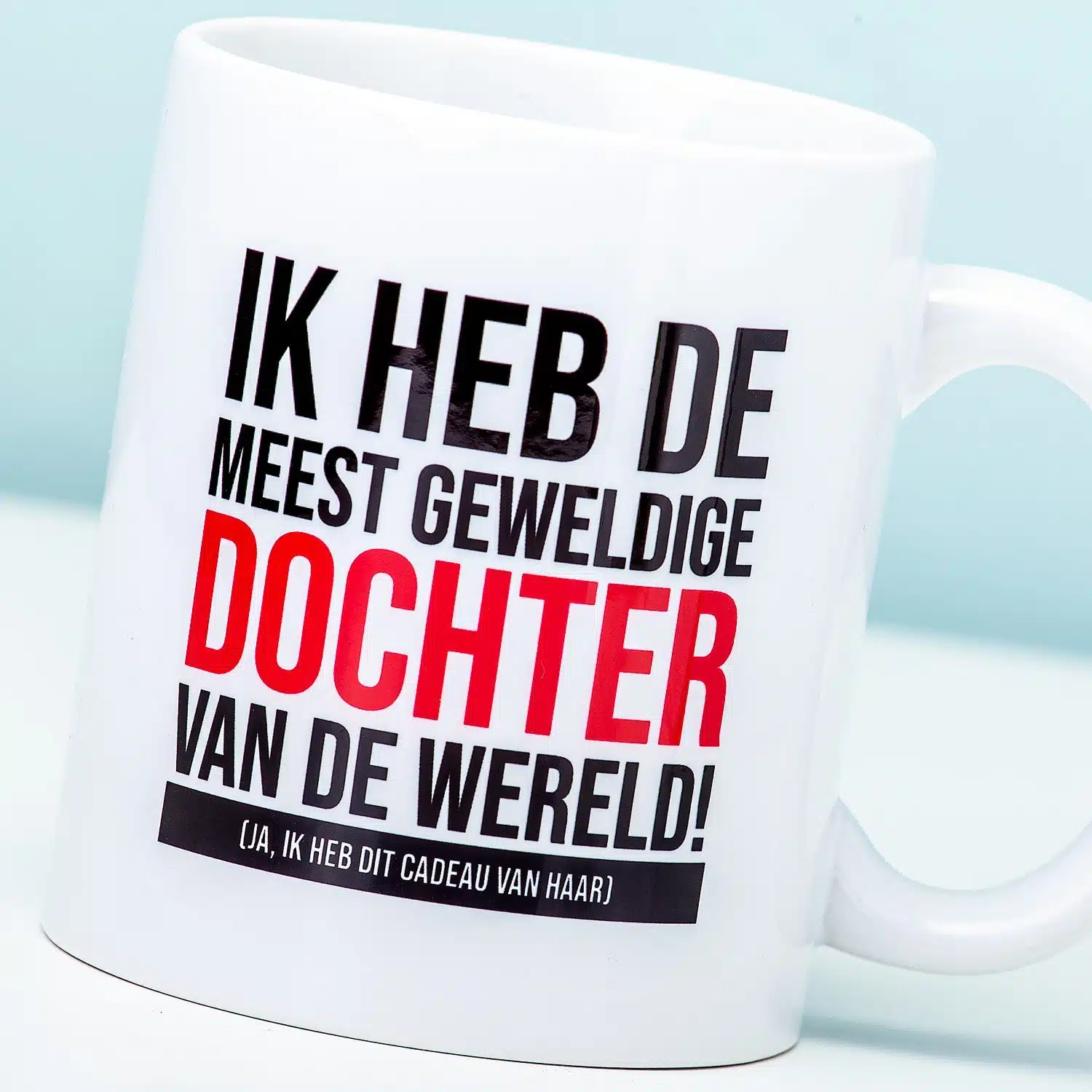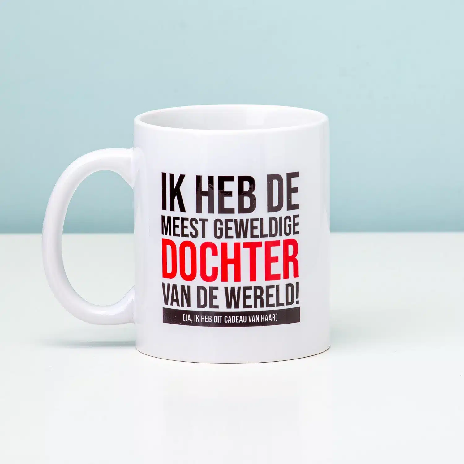 Jij hebt geweldige ouders. En jouw ouders, die hebben een geweldige dochter. En dat mag iedereen weten! Geef je pa of ma de Meest Geweldige Dochter mok cadeau. Deze koffiebeker heeft een opdruk met de tekst: Ik heb de meest geweldige dochter van de wereld! (Ja, ik heb dit cadeau van haar). De originele mok is een leuk cadeautje voor Moederdag of Vaderdag.