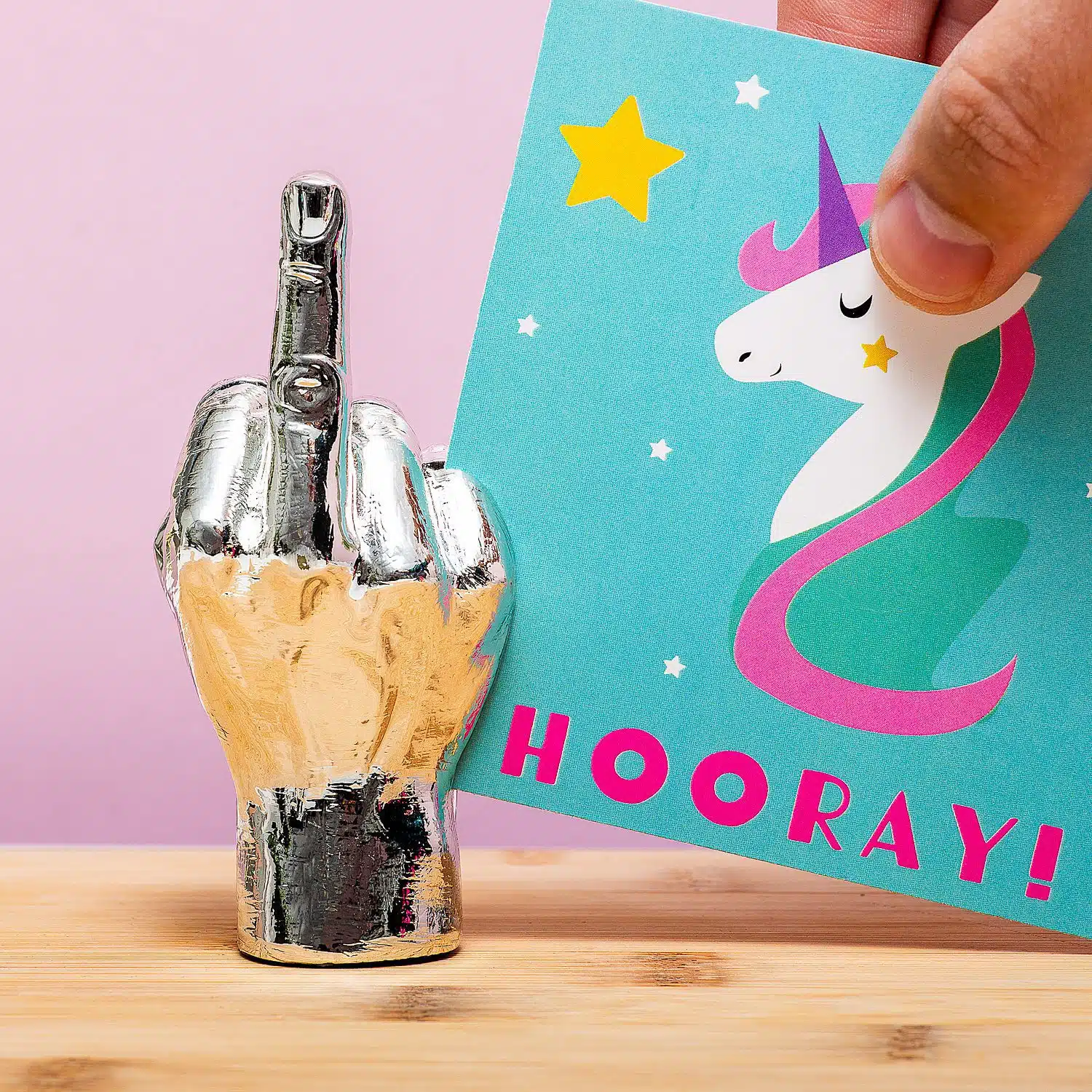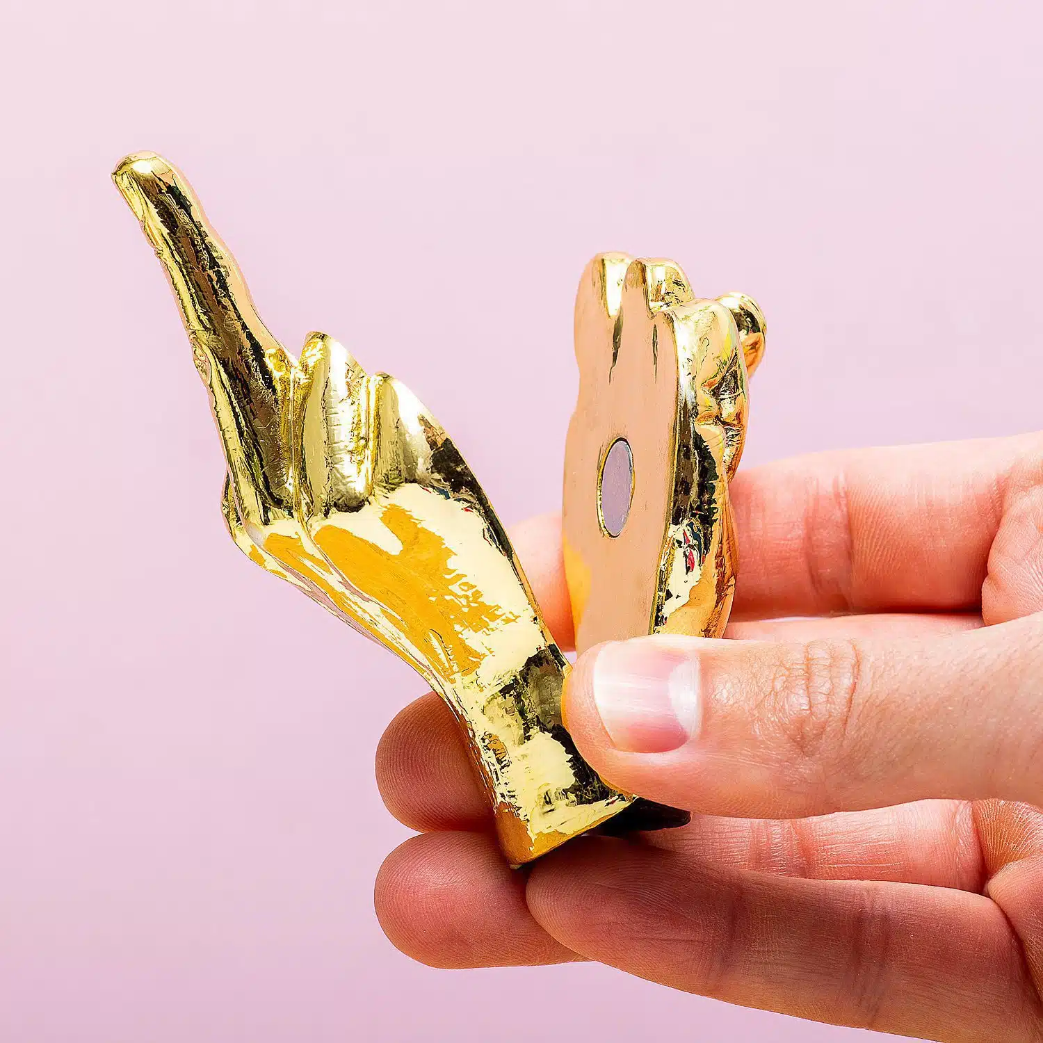 Heb jij schijt aan iedereen in je omgeving? Dat laat je eenvoudig zien met de Middelvinger fotohouder van Bitten in je huis of op je bureau. Deze grappige fotohouder steekt zijn middelvinger op. Zo laat jij zien dat je niks om de mening van anderen geeft of gewoon een lekker obstinaat type bent. De fotohouder bestaat uit twee delen met een magneet. Steekt er een foto of kaart tussen en je kunt er de hele dag naar kijken.