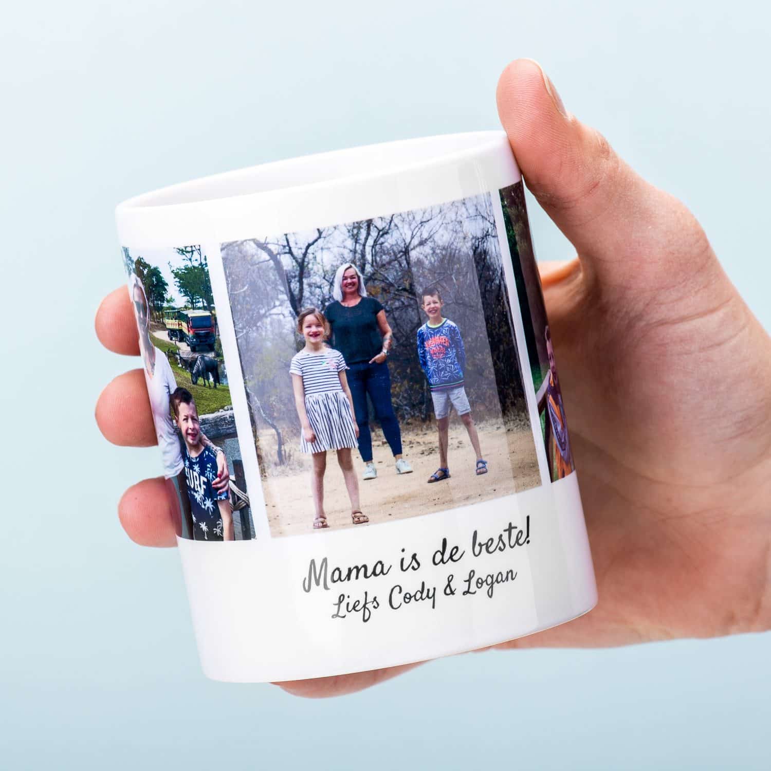 Verras je moeder Gepersonaliseerde fotomok Mijn mama is de beste. De tekst op deze lieve fotomok kun je zelf aanpassen: je kunt hem dus bijvoorbeeld ook gebruiken om haar beterschap te wensen. Upload jullie drie mooiste foto’s, vul een mooie tekst aan en je hebt het perfecte persoonlijke cadeau voor je mams.