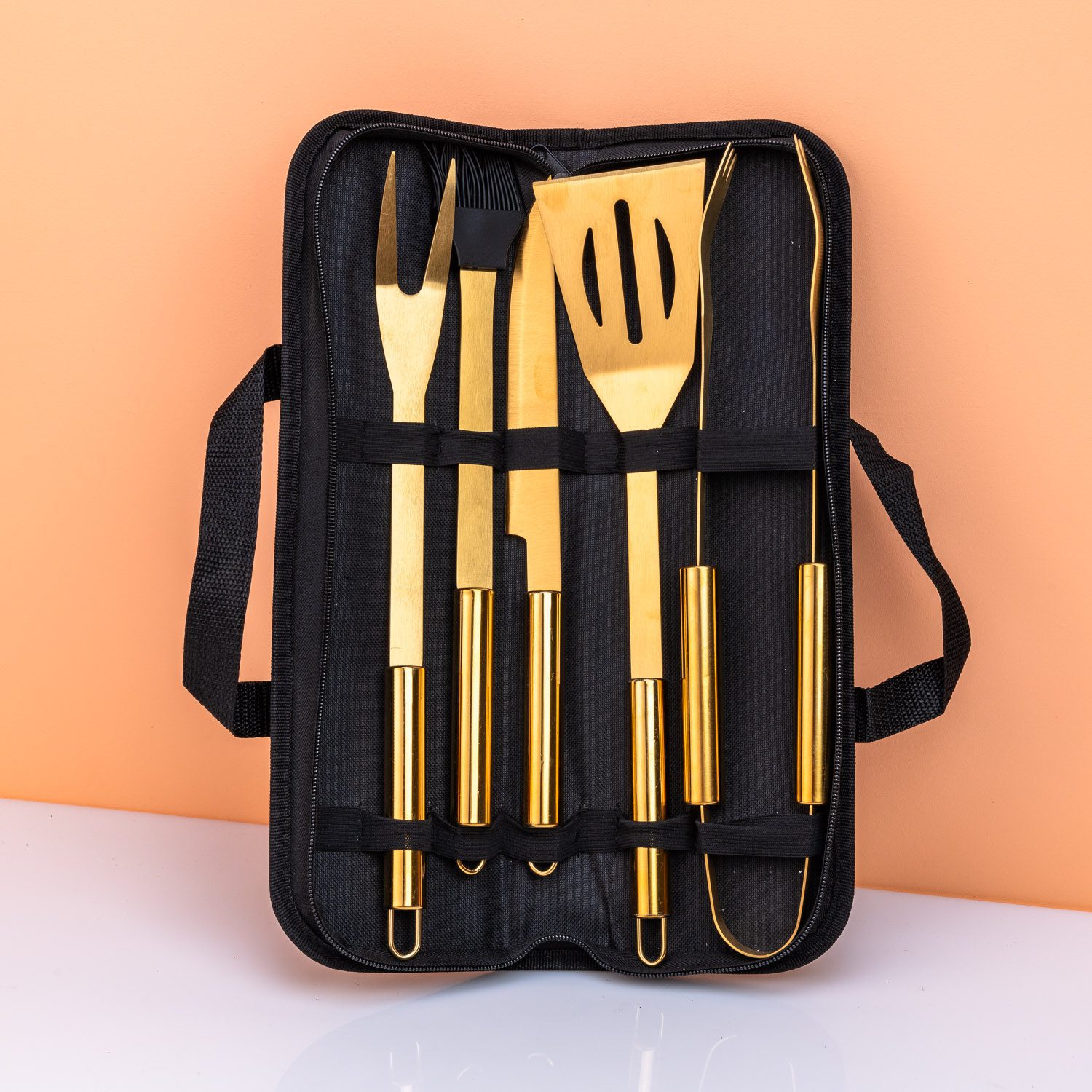 Til je BBQ feestje naar een hoger niveau met de Miljonairs BBQ tools (set van 5) van Mikamax. Deze originele set barbecuegereedschap heeft een gouden kleur, waardoor je opeens in stijl achter de grill staat. De set bevat een barbecuevork, stapel, tang, mes en een marinadekwast. De tools zitten zelfs verpakt in een luxe tas, dus als je indruk wilt maken op je vrienden, dan neem je je BBQ tools mee als zij een barbecue geven. Wedden dat jouw gereedschap het mooist is?