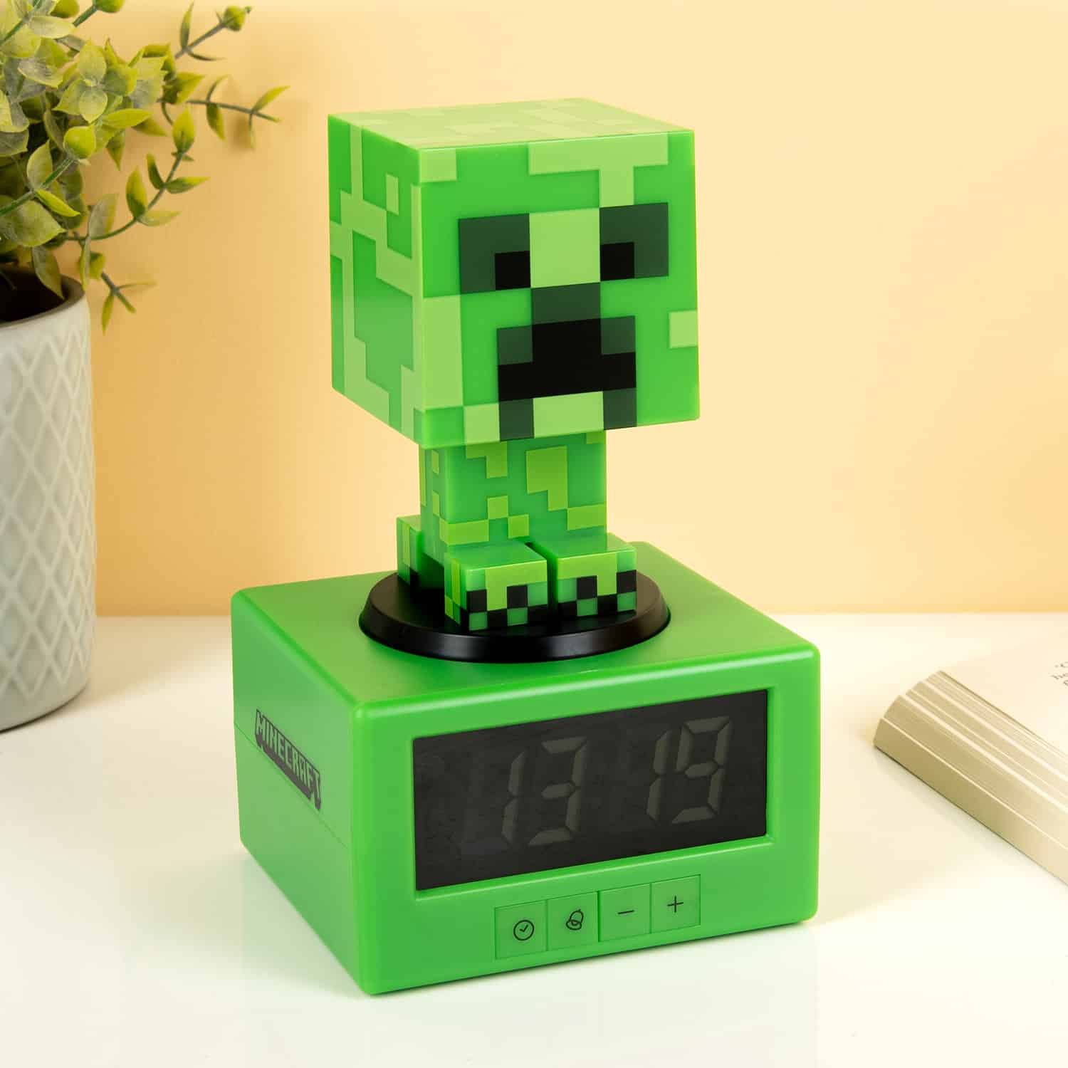 De tijd in Minecraft gaat dan misschien 72 keer sneller dan bij ons op aarde, de Creeper wekker met nachtlampje van Minecraft laat wel gewoon de normale tijd zien. De groene wekker is voorzien van een Creeper, die zowel de snooze-knop als een nachtlampje is. Deze grappige wekker is het perfecte cadeautje voor iedere jongere die ‘s ochtends niet uit bed te slepen is.