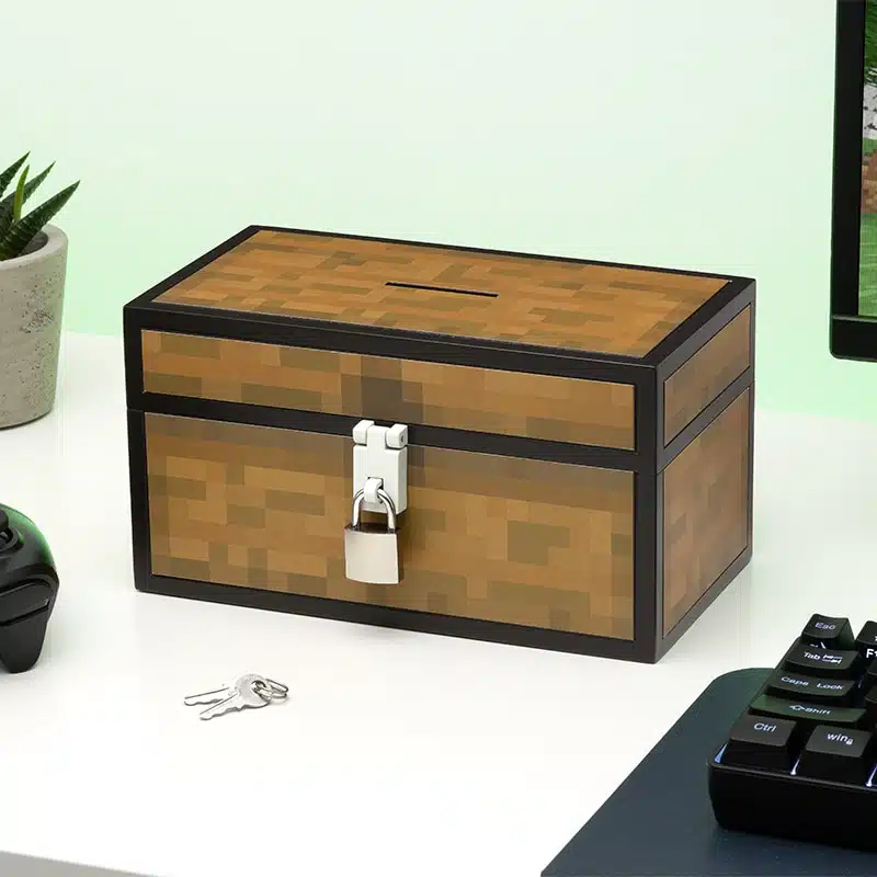 Upgrade je spaargame! De Koffer spaarpot van Minecraft is een spaarpot in de vorm van de iconische chest uit het spel. Met het bijgeleverde hangslotje kun je je zakgeld veilig bewaren: net als je eigen vault in de Overworld! Perfect voor alle block-builders en crafting champions die willen sparen voor hun volgende avontuur. Een gaaf cadeau voor Minecraft-fans!