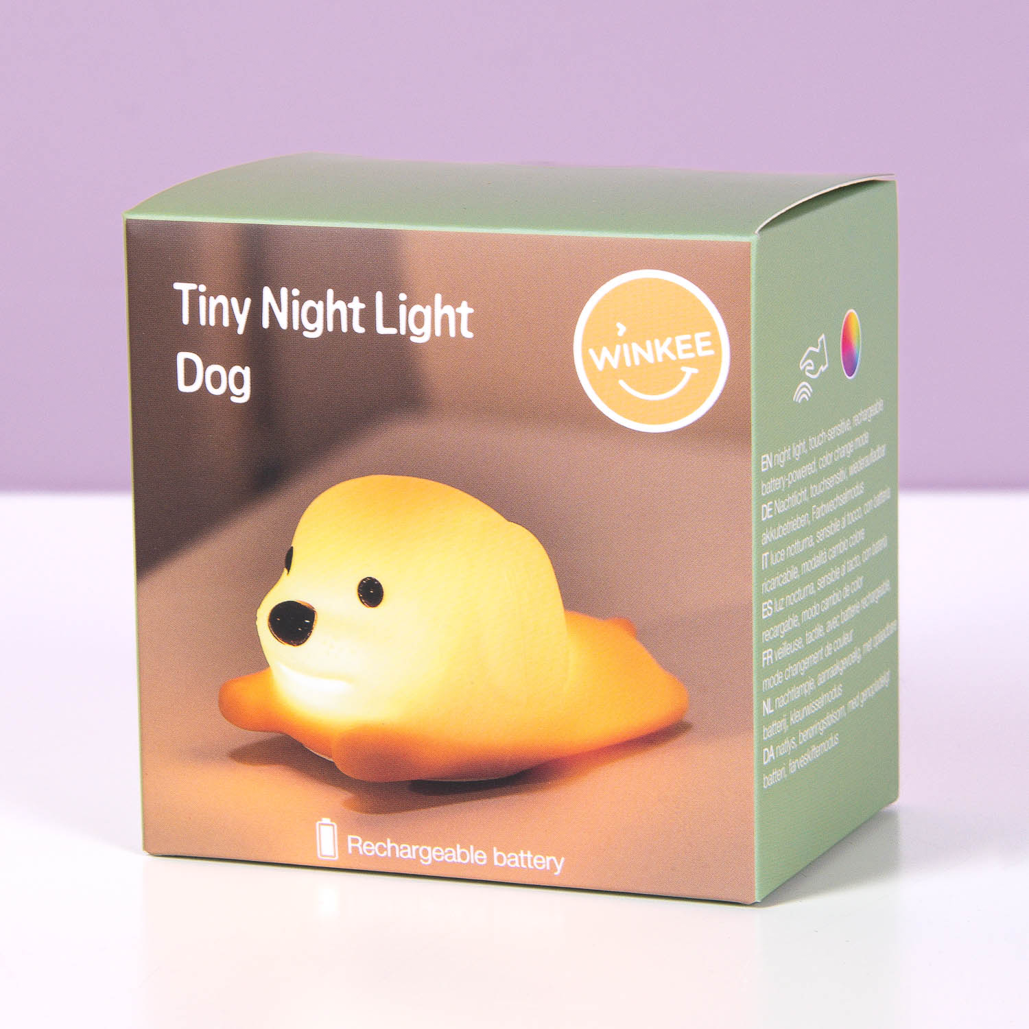 Het Mini hond nachtlampje van Winkee is een bruin hondje dat trouw op z’n plekje blijft zitten en licht geeft zonder te blaffen. Tik erop om de kleur en helderheid aan te passen: veel makkelijker dan een echte hond trainen. Perfect als gezellig lichtje voor kinderen die gezelschap willen ‘s nachts, zonder dat je om 6 uur ‘s ochtends naar buiten hoeft voor een wandeling. Alle voordelen van een hond, nul nadelen!