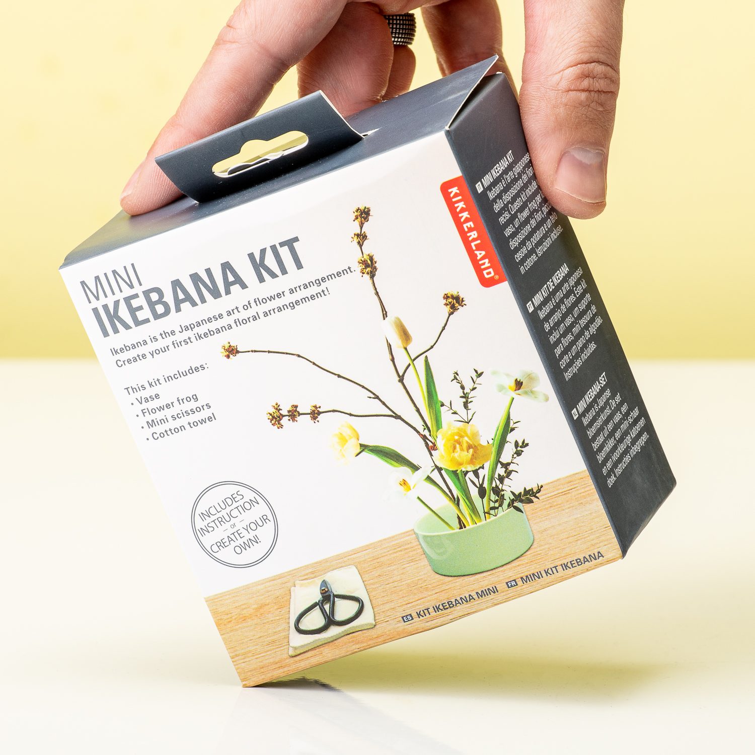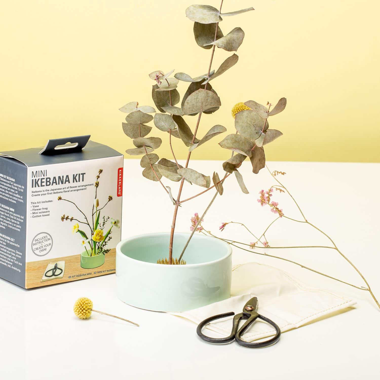 Ken jij Ikebana al? Deze Japanse vorm van bloemschikken combineert bloemen, takken en bladeren op een unieke manier. Met de Mini Ikebana set van Kikkerland kun je zelf op deze manier een bloemstuk maken. Ikebana staat voor ‘levende’ bloemen en deze worden altijd op een bepaalde manier in een platte vaas gezet. In deze do it yourself set zit een mintgroene lage vaas van keramiek, een schaartje, een katoenen doek en een flower frog.