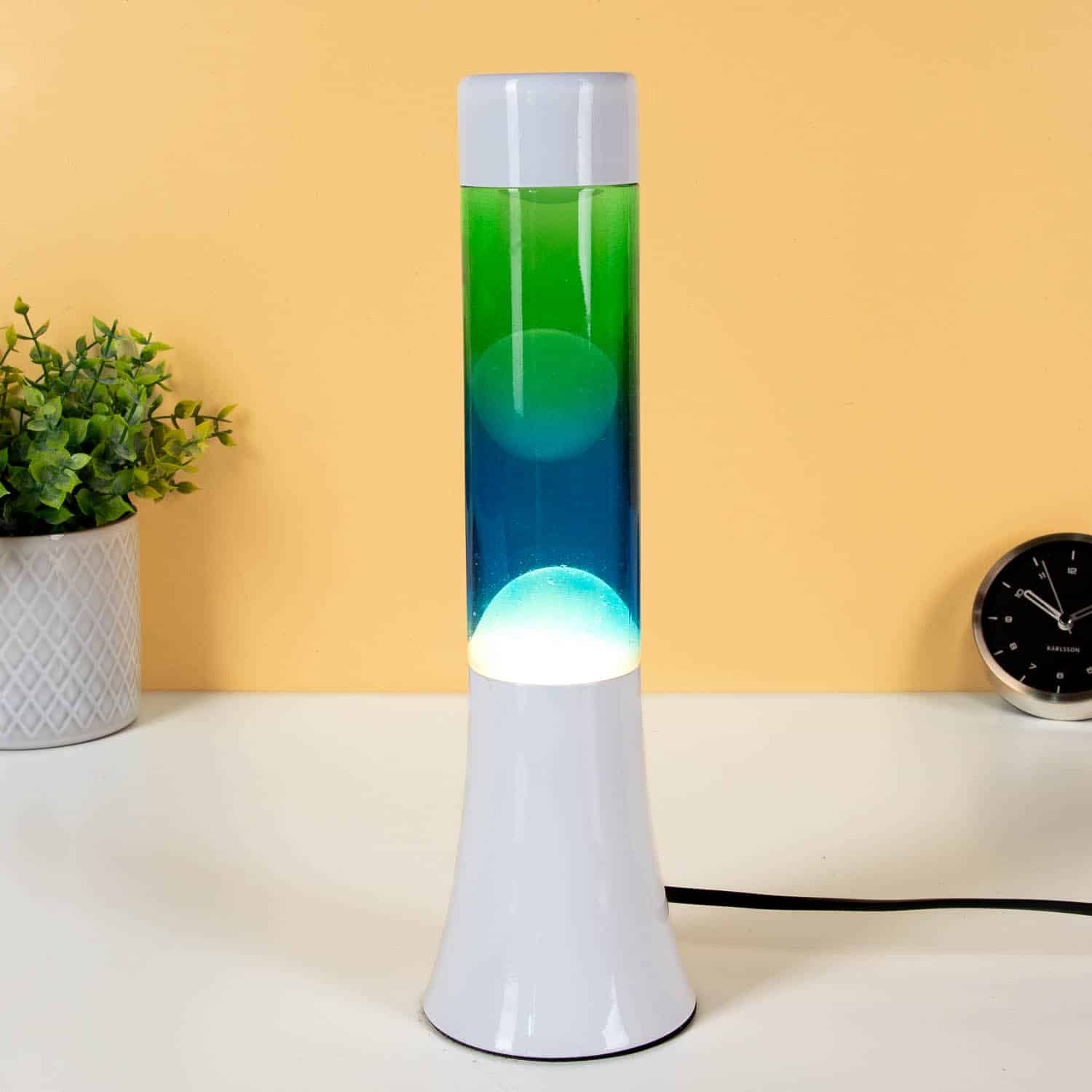 Hij is neutraal, door zijn witte basis, en toch opvallend door het groene en blauwe getinte glas: de Mini lavalamp blauw en groen gradient van Fisura. Deze stijlvolle lavalamp is gevuld met een transparante vloeistof waar de witte lava in bubbelt. Door de groene en blauwe kleuren van het glas, die in elkaar overlopen, ziet de lavalamp er fascinerend uit en is ontspannen om naar te kijken.