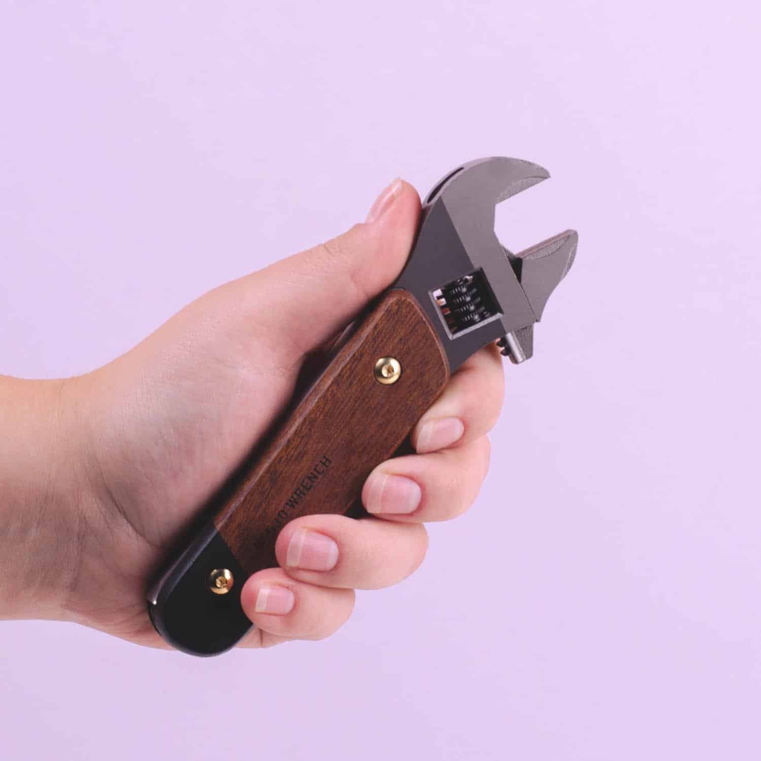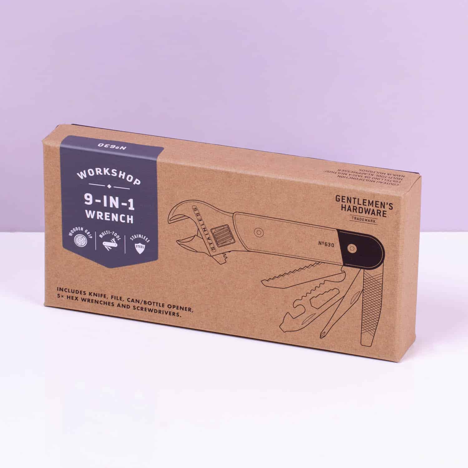 Stijlvolle multitool met houten handvat en negen tools. Met verstelbare moersleutel, zaag, vijl, mes, blik- en flesopener, schroevendraaiers en vijf inbussleutels.