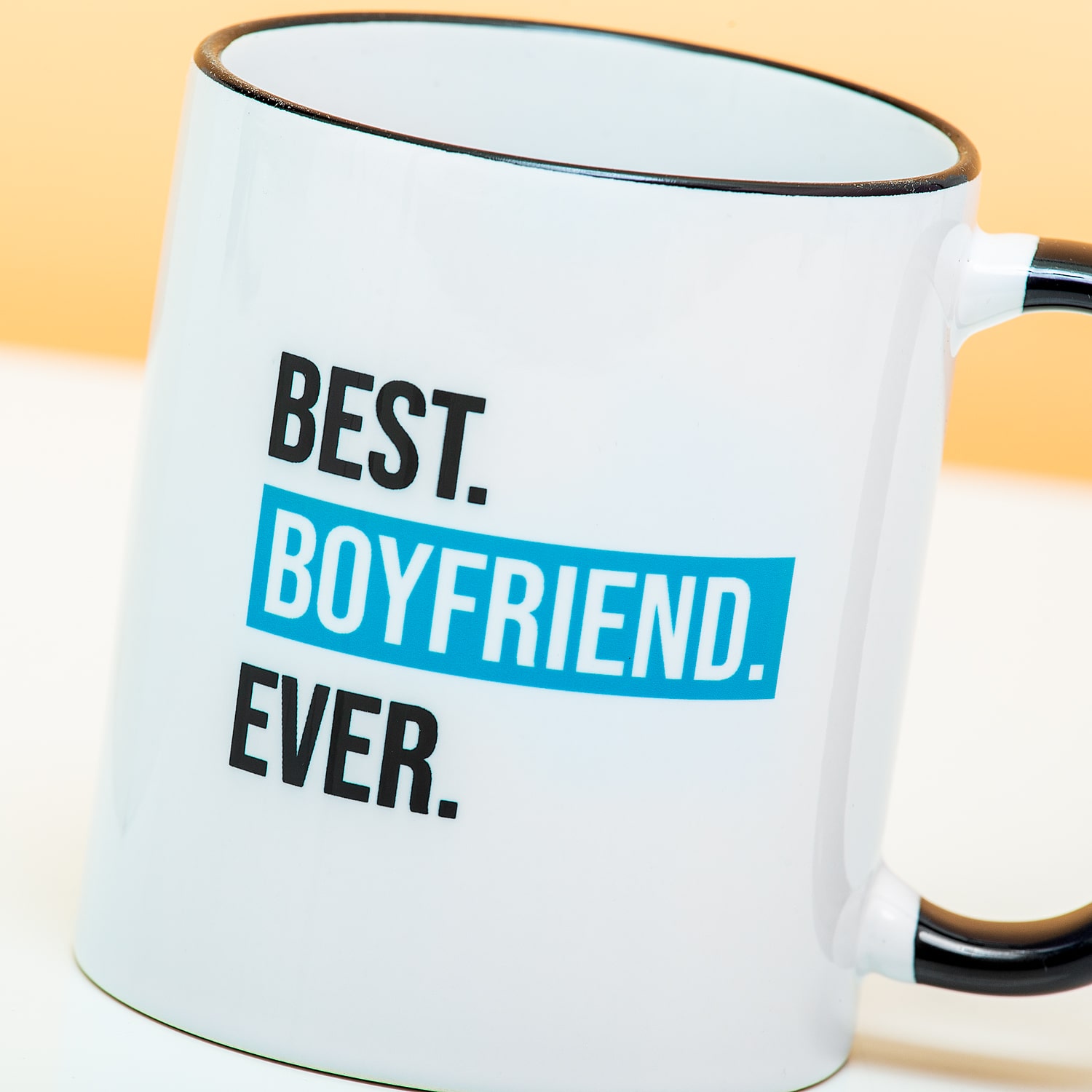 Wit met zwarte mok met de tekst: BEST. BOYFRIEND. EVER. Om cadeau te geven aan je vriend, omdat hij de allerleukste is. Als cadeau voor Valentijn, zijn verjaardag of gewoon zomaar.