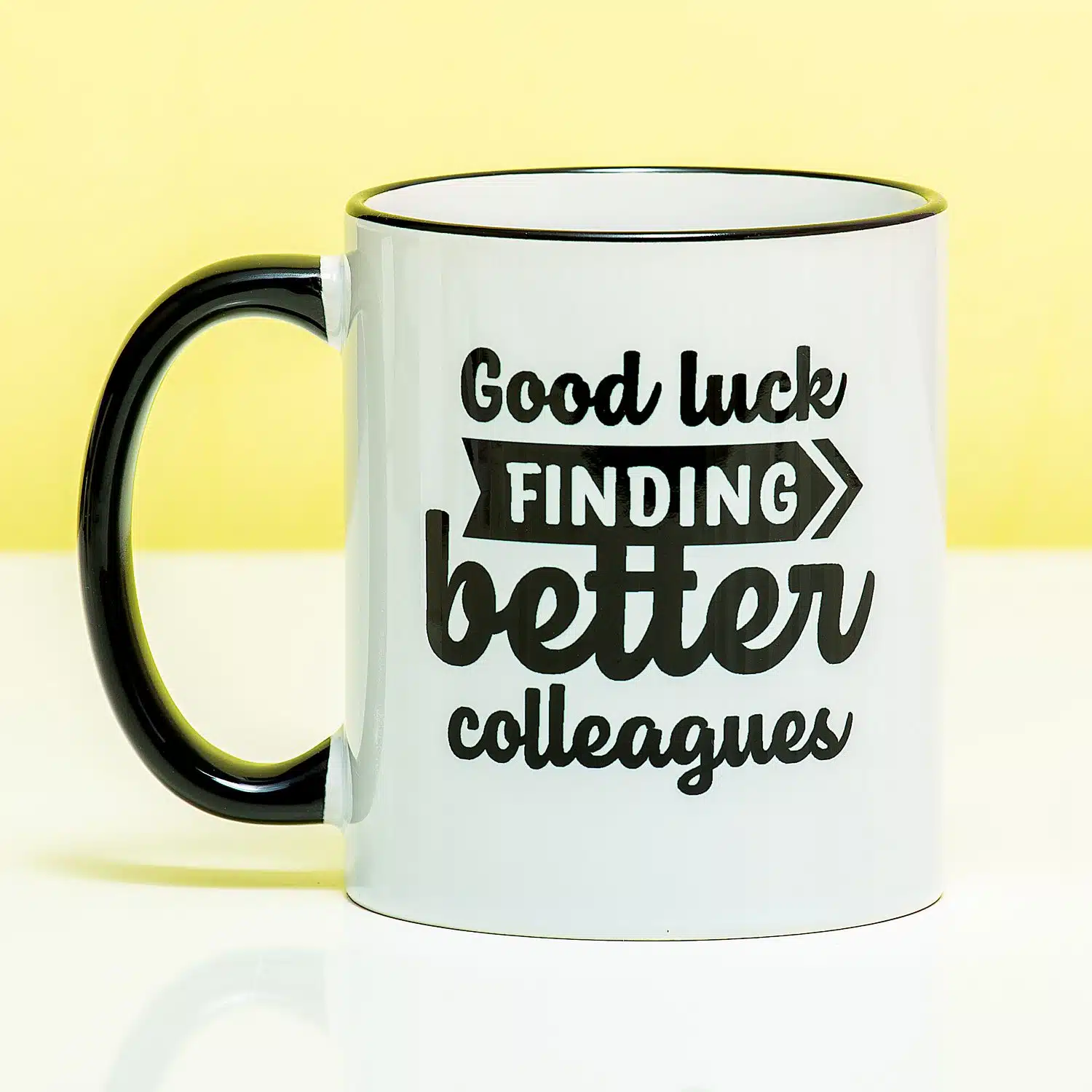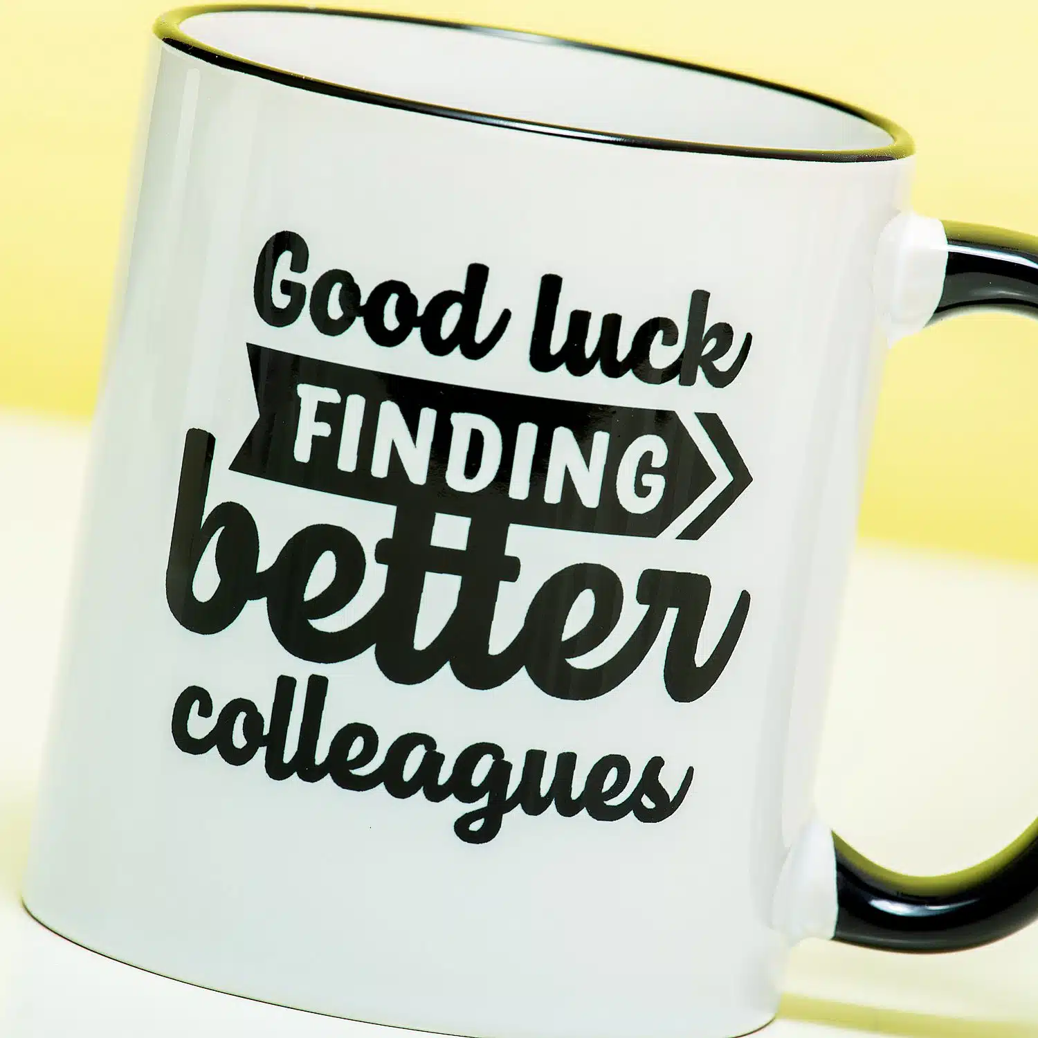 Als je leukste collega een nieuwe baan heeft, dan is er maar één gepaste reactie: zo sarcastisch mogelijk uit de hoek komen. Met de Mok Better colleagues lukt dat prima. Op deze koffiebeker staat de tekst Good luck finding better colleagues. Zo hoef je je gevoelens niet te tonen en dat is wel zo makkelijk, toch?