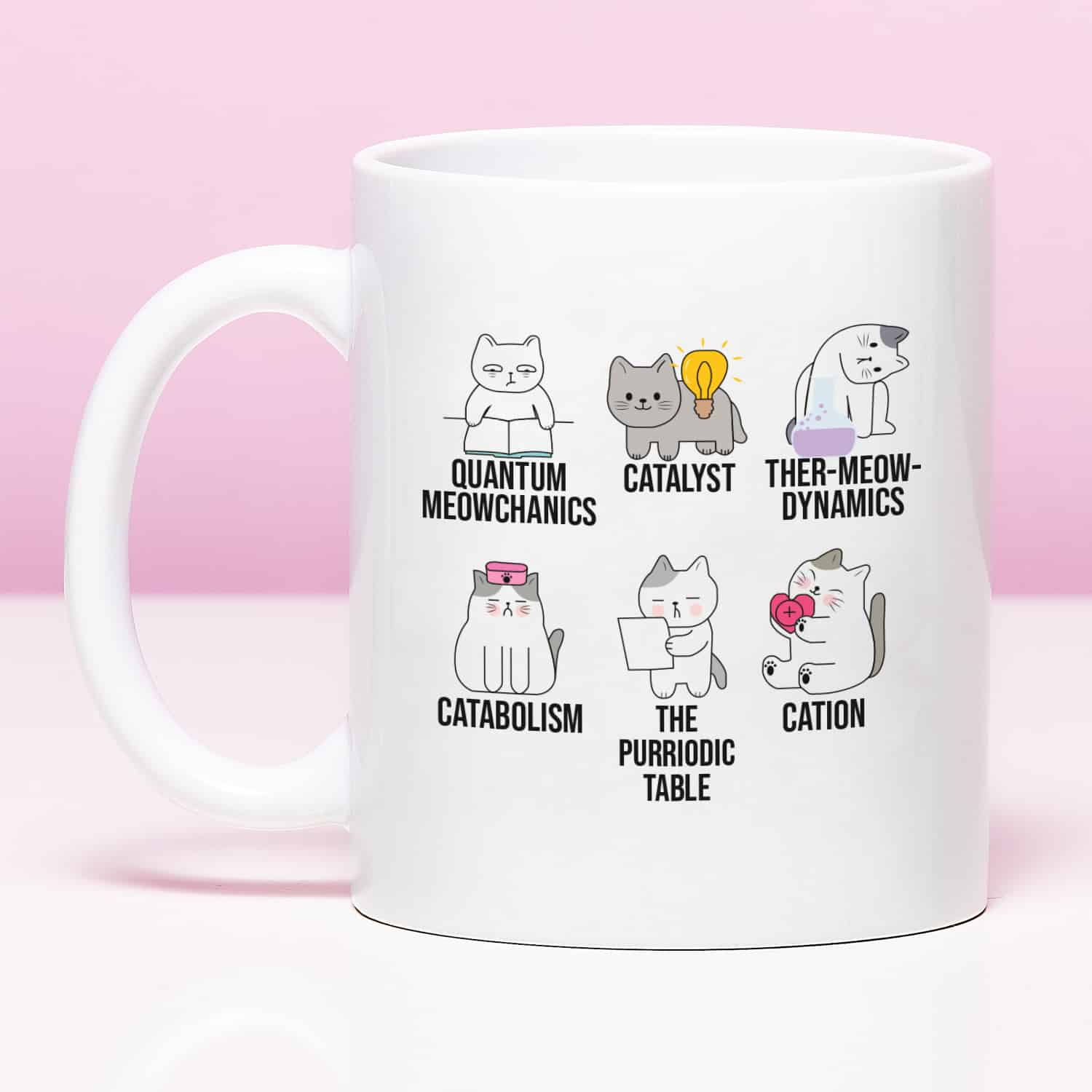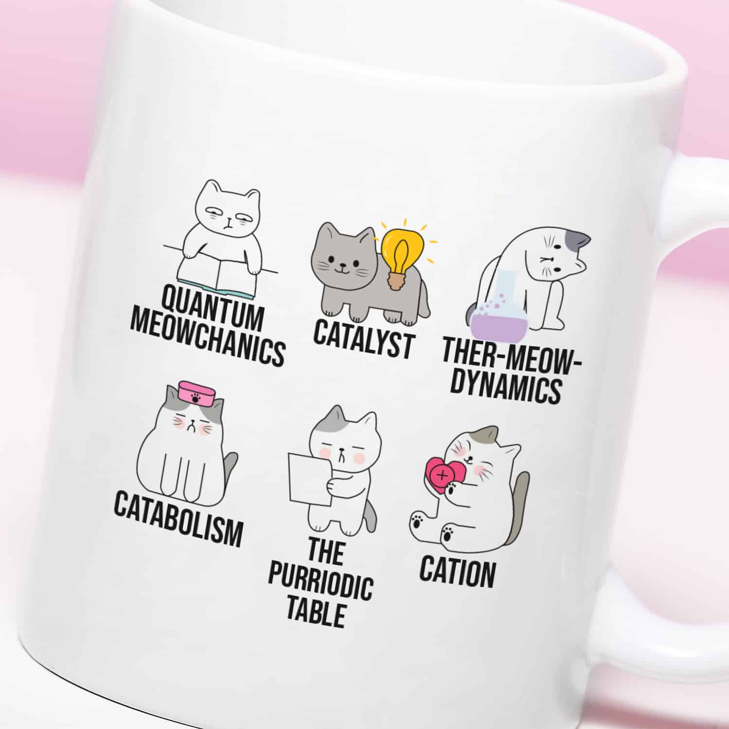 De Mok Cats in stem is perfect voor kattenliefhebbers met een zwak voor woordgrappen. Op de beker staan schattige katten in wetenschappelijke thema’s zoals Quantum Meowchanics en The Purrioidic Table. Een grappige koffiemok die elke koffiepauze slim én luchtig maakt.
