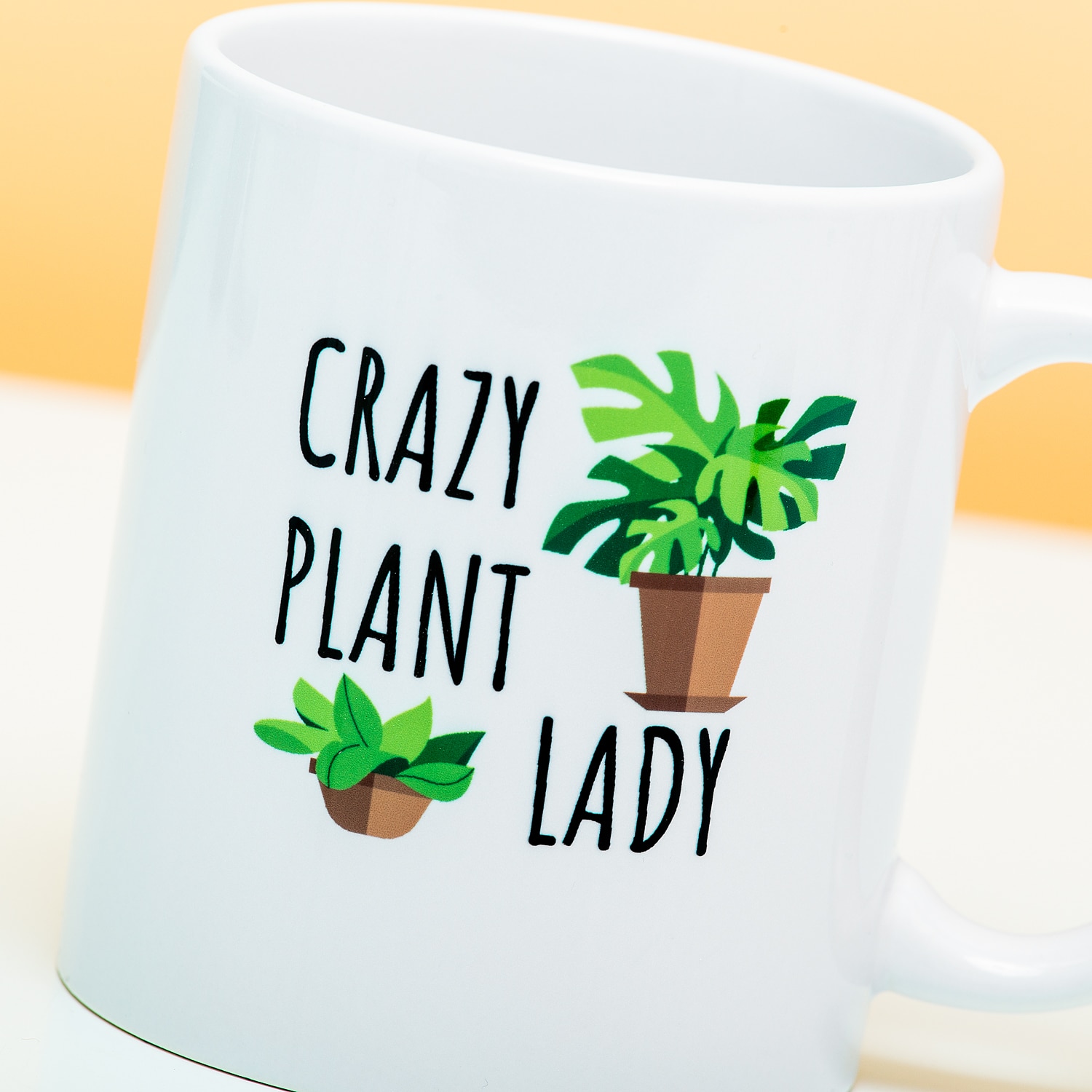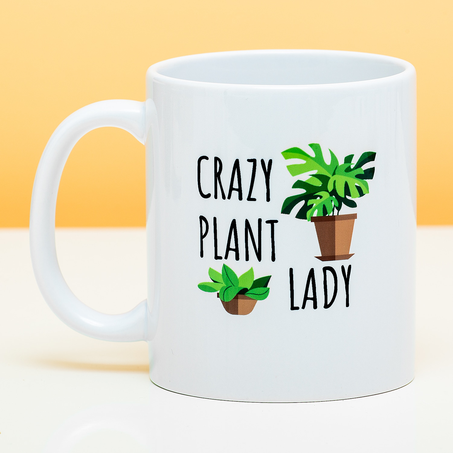 Witte mok met de tekst Crazy Plant Lady en twee geïllustreerde planten.