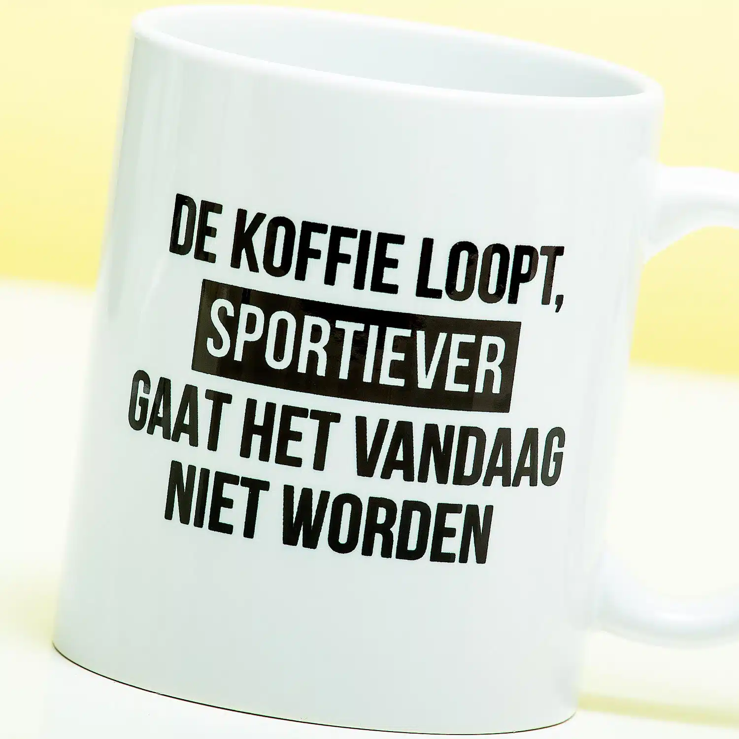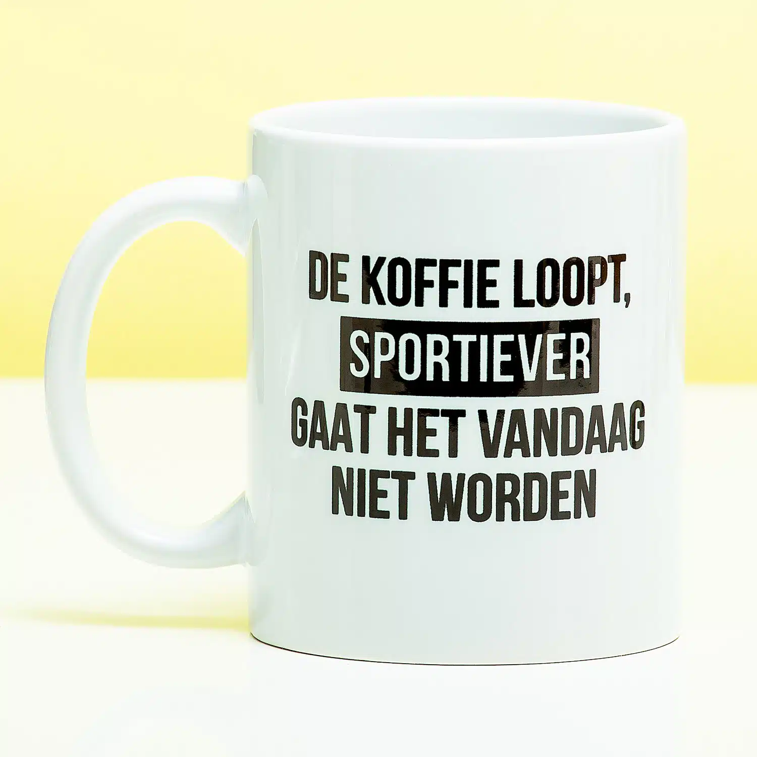 Geen zin om sportief te zijn vandaag? Of morgen? Of volgende week? De Mok De koffie loopt is er speciaal voor onsportieve types die helemaal geen zin hebben om zichzelf af te beulen. Op de mok staat de tekst: De koffie loopt, sportiever gaat het vandaag niet worden. Een grappig cadeau voor collega’s die liever lui zijn dan moe.
