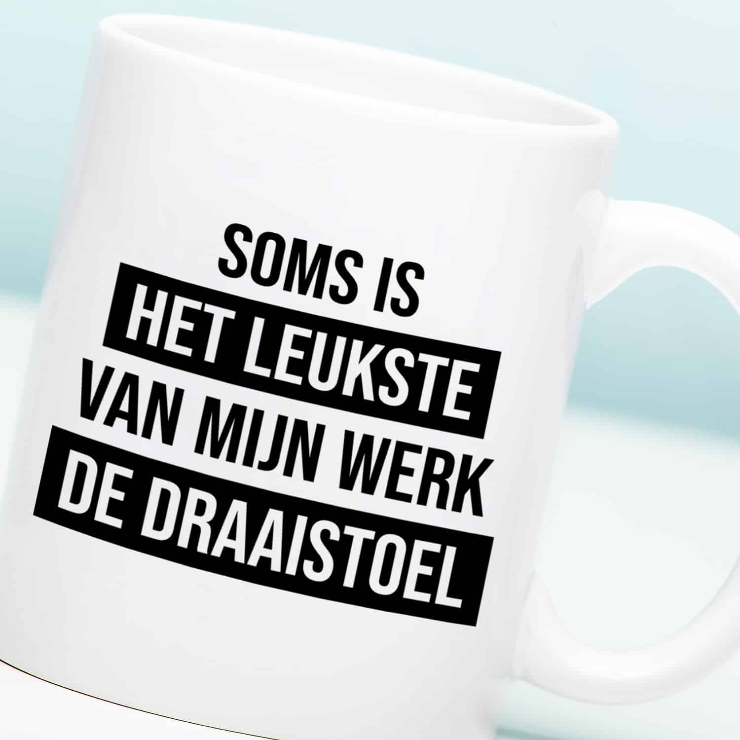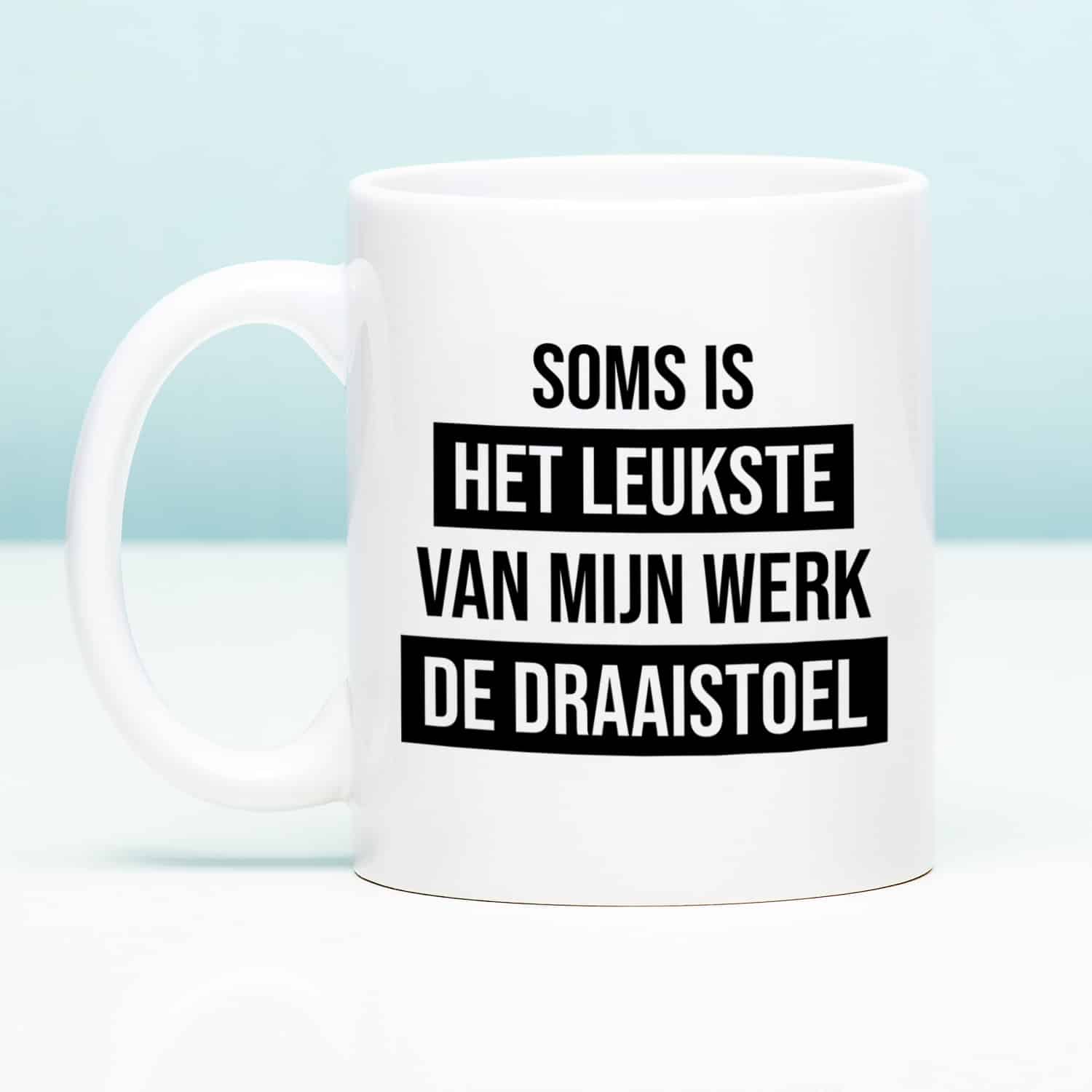 Soms heb je van die dagen dat het allemaal even tegenzit op het werk. Je haalt je deadline niet, je favoriete collega is op vakantie en je baas is een bitch. Gelukkig is er dan altijd nog je draaistoel! De Mok Draaistoel is voor iedereen die in zijn draaistoel doet alsof ‘ie op de kermis doet: tollen tot je duizelig bent. Op de mok staat de tekst: Soms is het leukste van mijn werk de draaistoel.