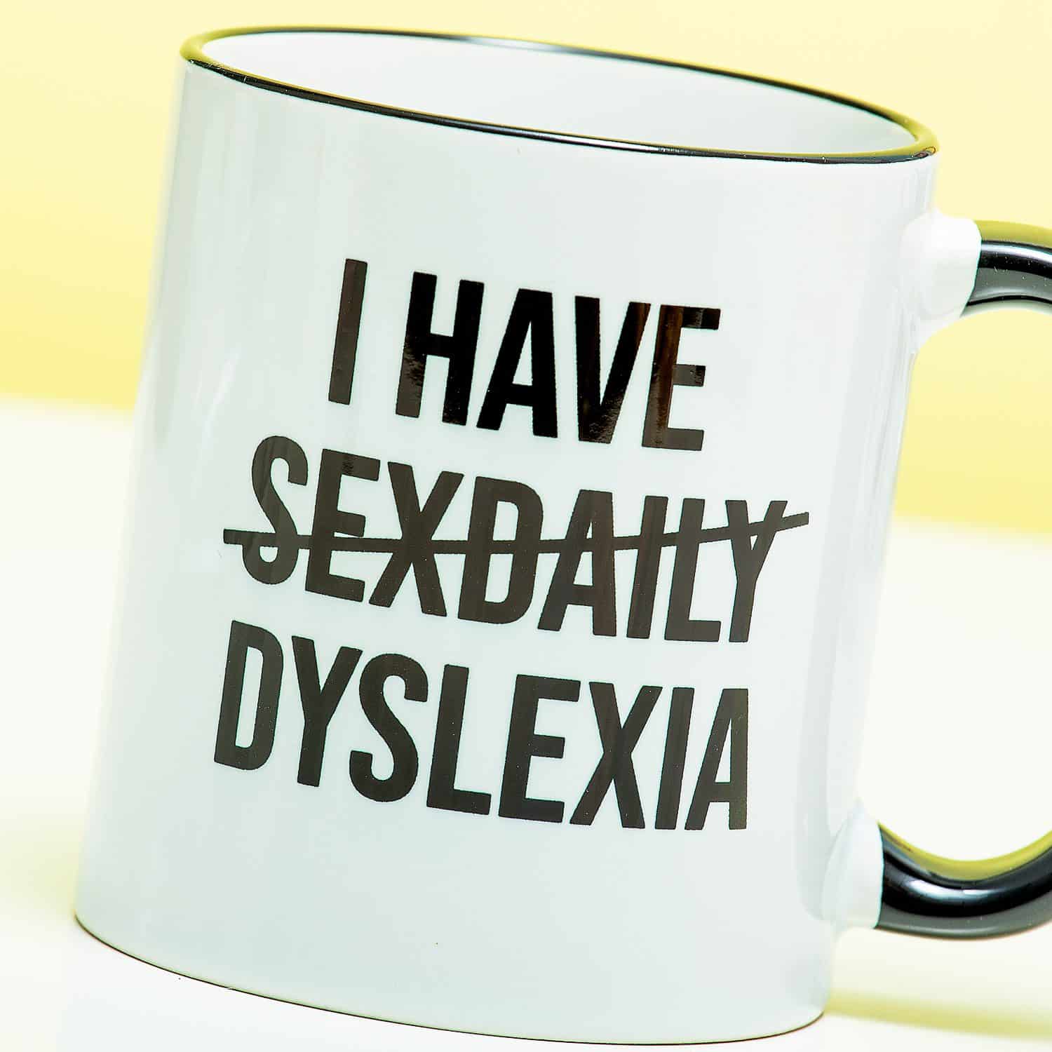 Dyslexie: we willen er geen grapjes over maken, maar je moet toegeven dat de Mok Dyslexie grappig is. Op deze beker staat de tekst: I have sexdaily. Hierbij is sexdaily doorgestreept en vervangen door het woord dyslexia.