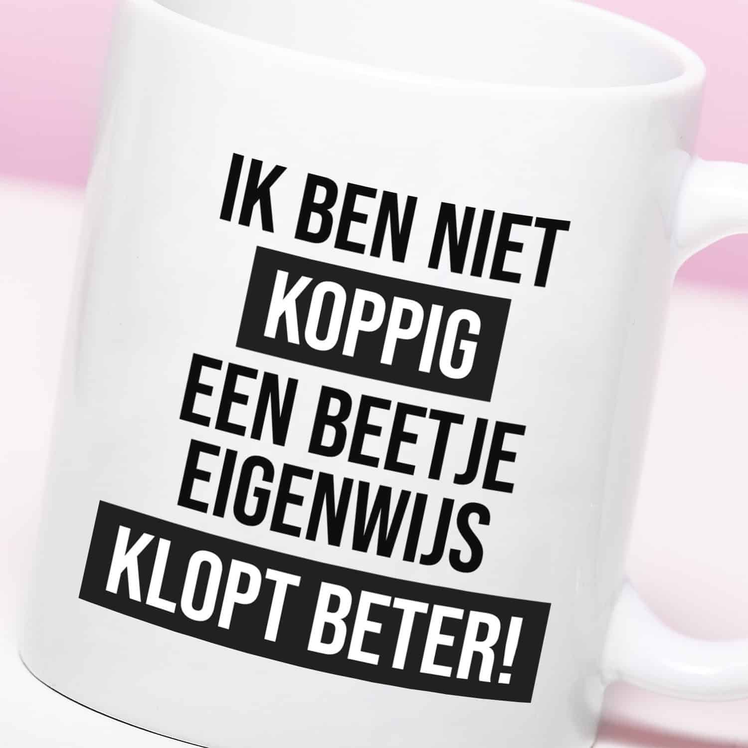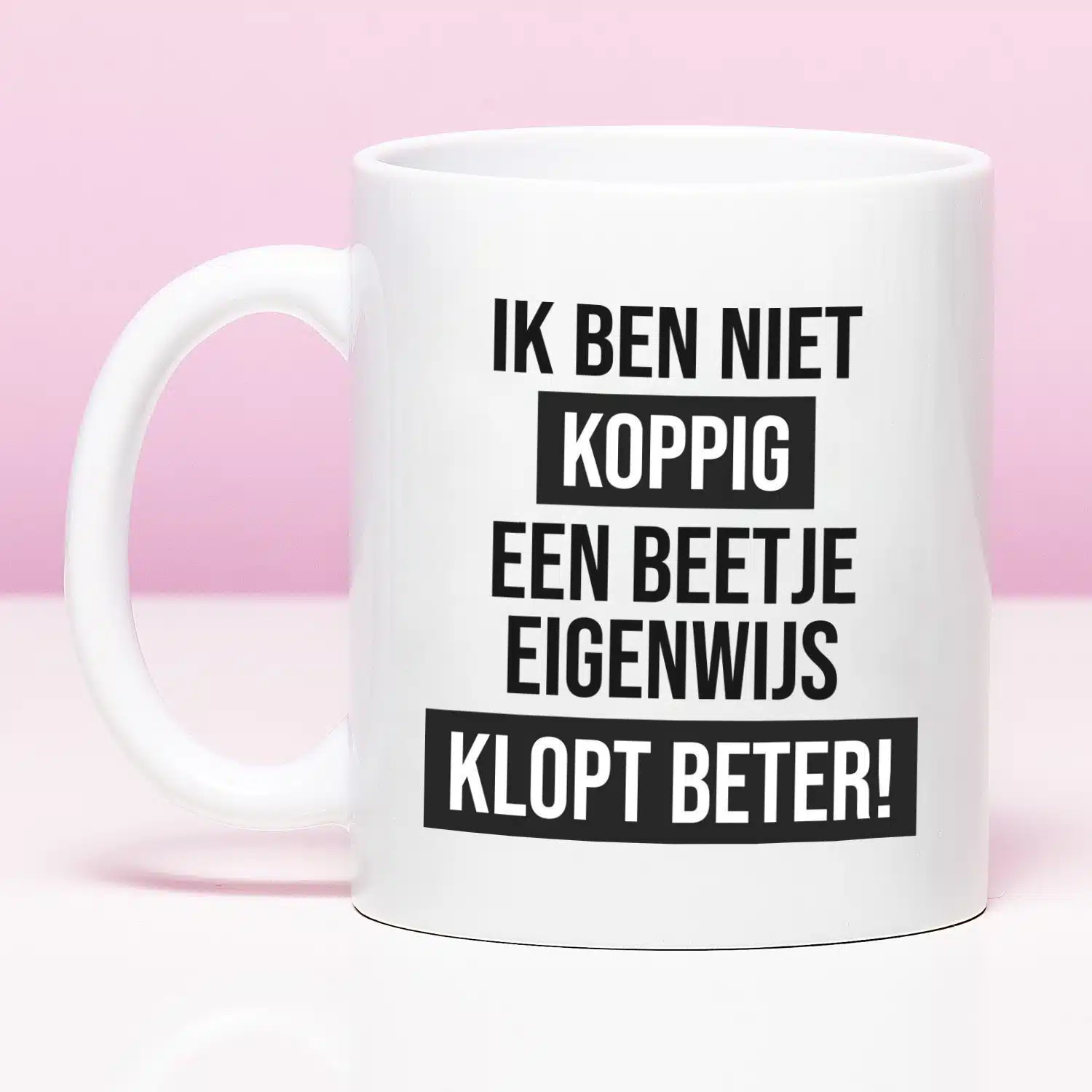Koppig? Welnee, jij niet. Een klein beetje eigenwijs misschien wel. Tenminste, dat maak je jezelf wijs. De mensen in je omgeving weten wel beter! De Mok Een beetje eigenwijs is een grappige koffiemok met de tekst: Ik ben niet koppig, een beetje eigenwijs klopt beter! Voor die dwarse collega of eigenwijze vriendin.