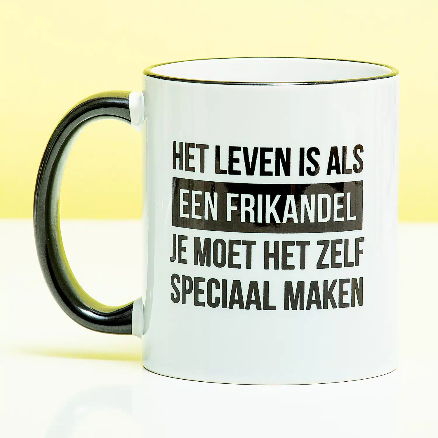 Vergeet de feestjes en de slingers: jij bent dol op frikandellen. De Mok Frikandel speciaal tovert elke dag een glimlach op je gezicht. Op de beker staat de tekst: Het leven is als een frikandel. Je moet het zelf speciaal maken. En dat is de waarheid als een koe. Dit is het perfecte cadeautje voor iedereen die in het weekend de snackbar plundert.