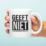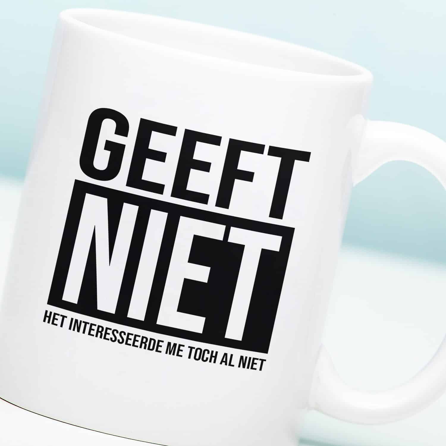 Elke maandag is het hetzelfde liedje: je moet luisteren naar de saaie verhalen van je collega’s over de zoveelste verloren voetbalwedstrijd of andere oninteressante belevenissen. Met de Mok Geeft niet laat je zien dat ze daarmee bij jou niet hoeven aan te komen. Op de beker staat de tekst: GEEFT NIET. Het interesseerde me toch al niet. Ook handig als je niet hoeft deel te nemen aan een project wat je toch al niet zag zitten.