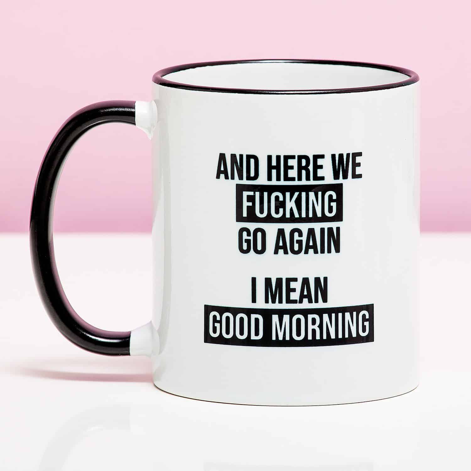 Daar is ‘ie weer: het begin van je werkweek. Heb jij er ook zo’n zin in? Laat het aan iedereen zien, met de Mok Here We Fucking Go Again. Op deze mok staat de tekst: And Here we fucking go again. I mean good morning. Lollige koffiemok voor je zonnigste collega.