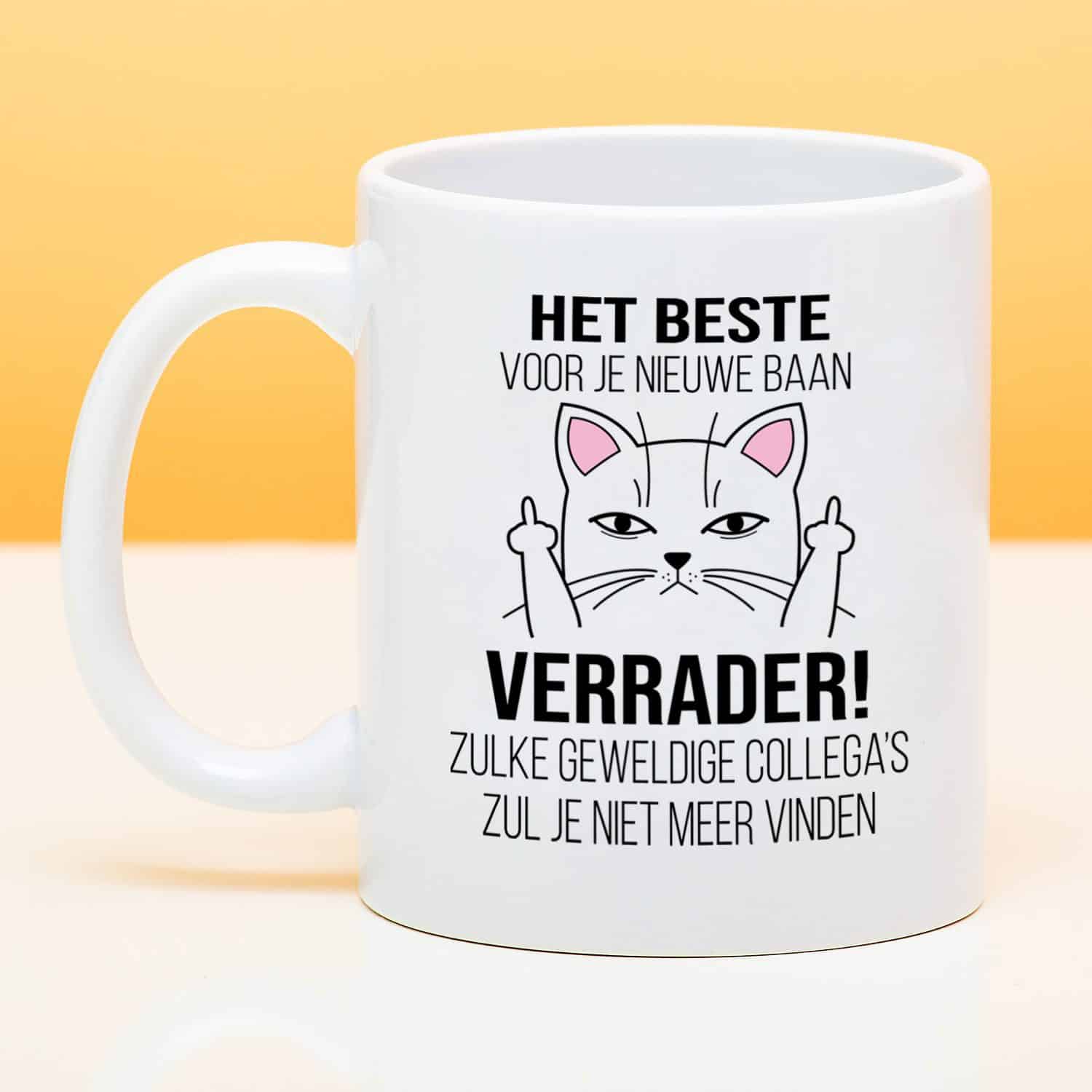 Je leukste collega heeft een nieuwe baan en dat vind je helemaal niet leuk. Met de Mok Het beste voor je nieuwe baan laat je dat duidelijk merken. De tekst op de mok begint vriendelijk, met de woorden: het beste voor je nieuwe baan. Maar daaronder staat de tekst: Verrader! Zulke geweldige collega’s zul je niet meer vinden. En oh ja, een illustratie van een kat die zijn middelvingers opsteekt.