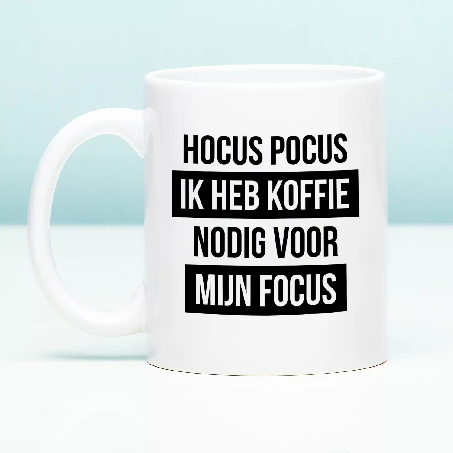 Werken zonder dat je koffie hebt gehad: dat werkt toch voor niemand? Neem de Mok Hocus pocus mee naar het werk, dan weten collega’s dat ze je koffie moeten blijven voeren. Op deze grappige beker staat de tekst: hocus pocus, ik heb koffie nodig voor mijn focus. Een leuke mok voor op kantoor en natuurlijk ook om cadeau te geven aan een collega.