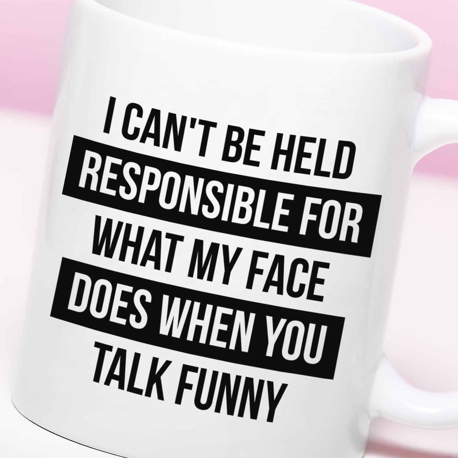 Een cadeautje voor je sarcastische collega uitzoeken? Zoek niet verder, want wij hebben het: de Mok I Can’t Be Held Responsible. Dit is de pérfecte mok om op het werk te gebruiken. Op de beker staat de tekst: I can’t be held responsible for what my face does when you talk funny. Dus ook al schiet je collega een keer in de lach tijdens het verhaal van een ander, het is niet zijn of haar schuld.