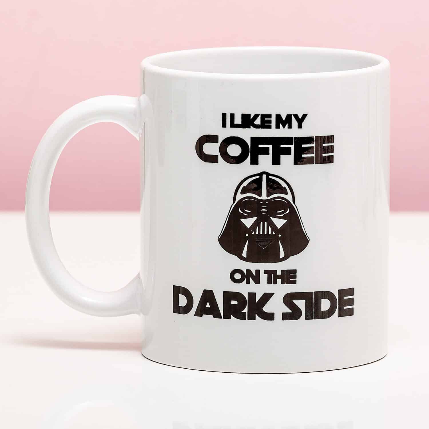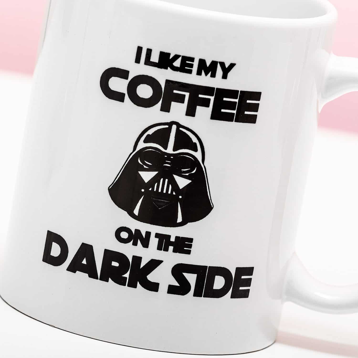 Hey Star Wars fan! Wij hebben een originele beker voor je. De Mok I Like My Coffee On The Dark Side is bedrukt met deze tekst en een afbeelding van Darth Vader,