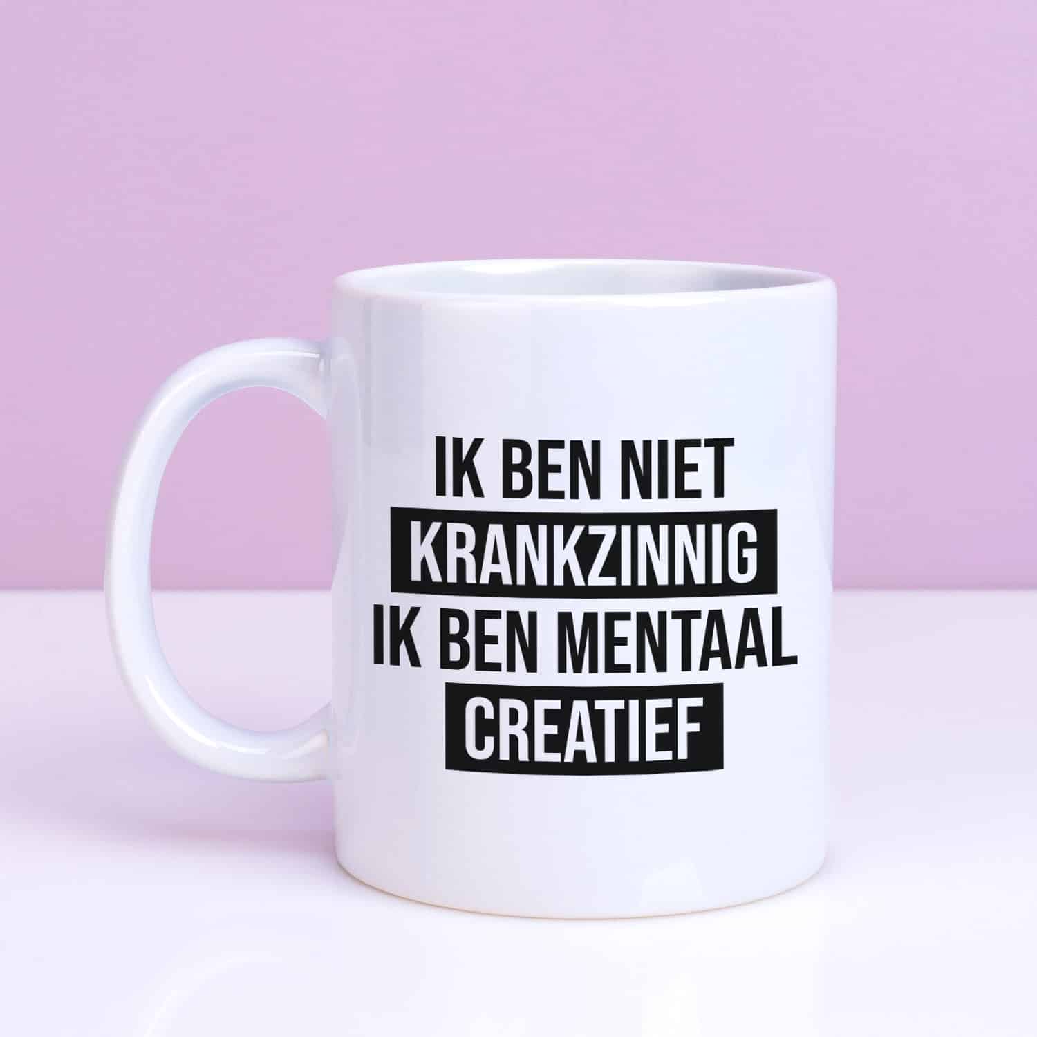 De Mok Ik ben niet krankzinnig, ik ben mentaal creatief is een humoristische koffiemok voor iedereen die buiten de lijntjes denkt.