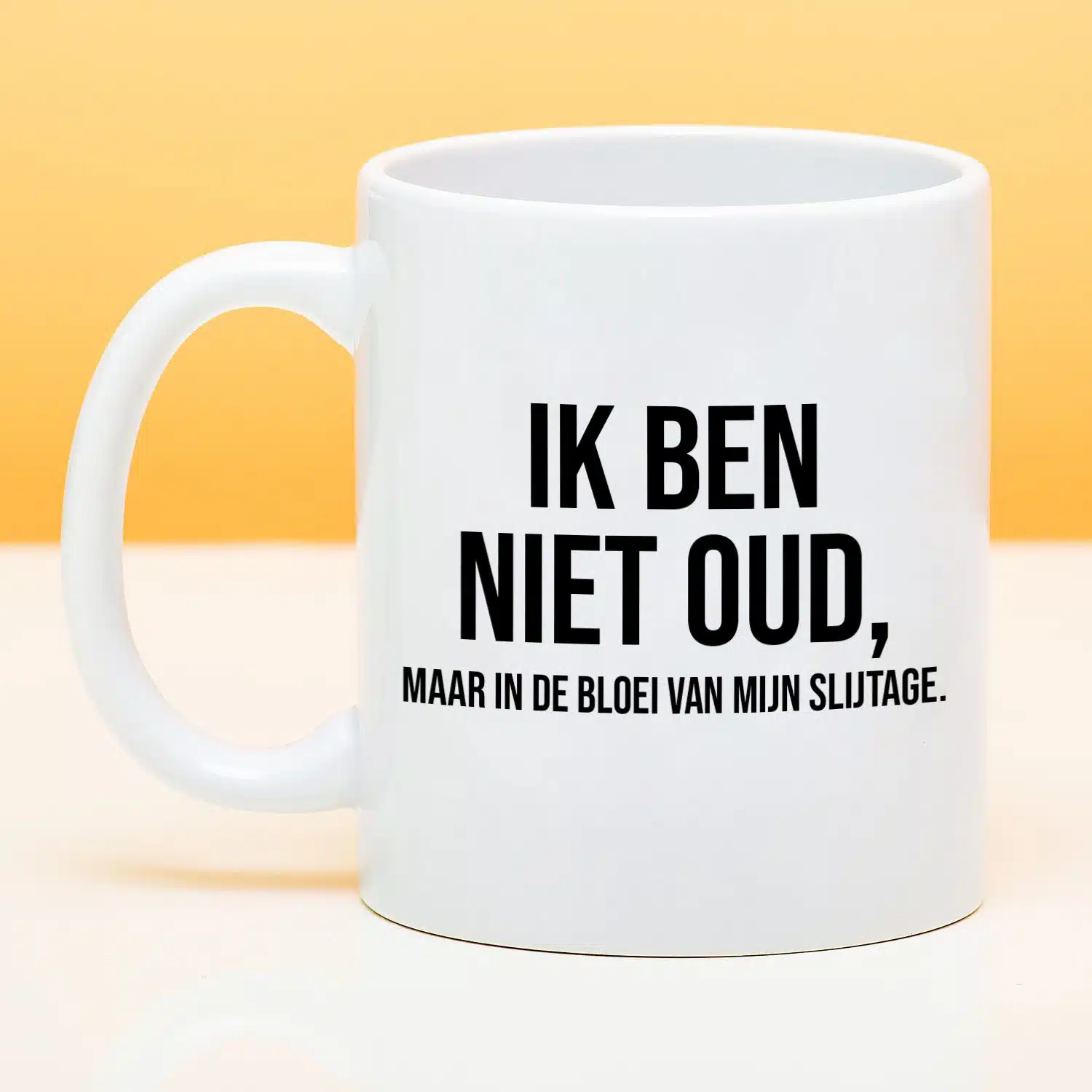 Jongeren zullen je oud vinden als je 50 bent, terwijl babyboomers je nog een snotaap vinden. Maar jij weet hoe het zit: je bent niet oud, maar in de bloei van je slijtage. Dat is dan ook wat de Mok Ik ben niet oud uitdraagt. Op deze witte koffiemok staat de tekst: Ik ben niet oud, maar in de bloei van mijn slijtage. Een lollige beker om te gebruiken als je veel jonge collega’s hebt, maar ook om als verjaardagscadeau te geven.