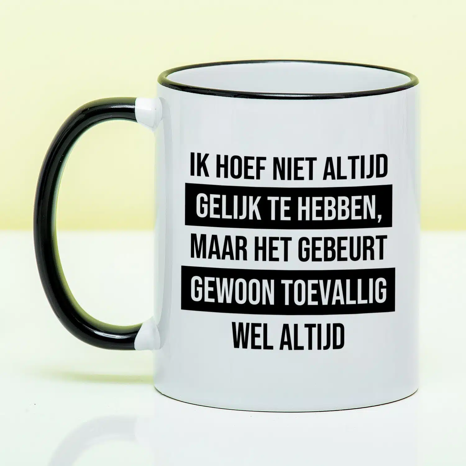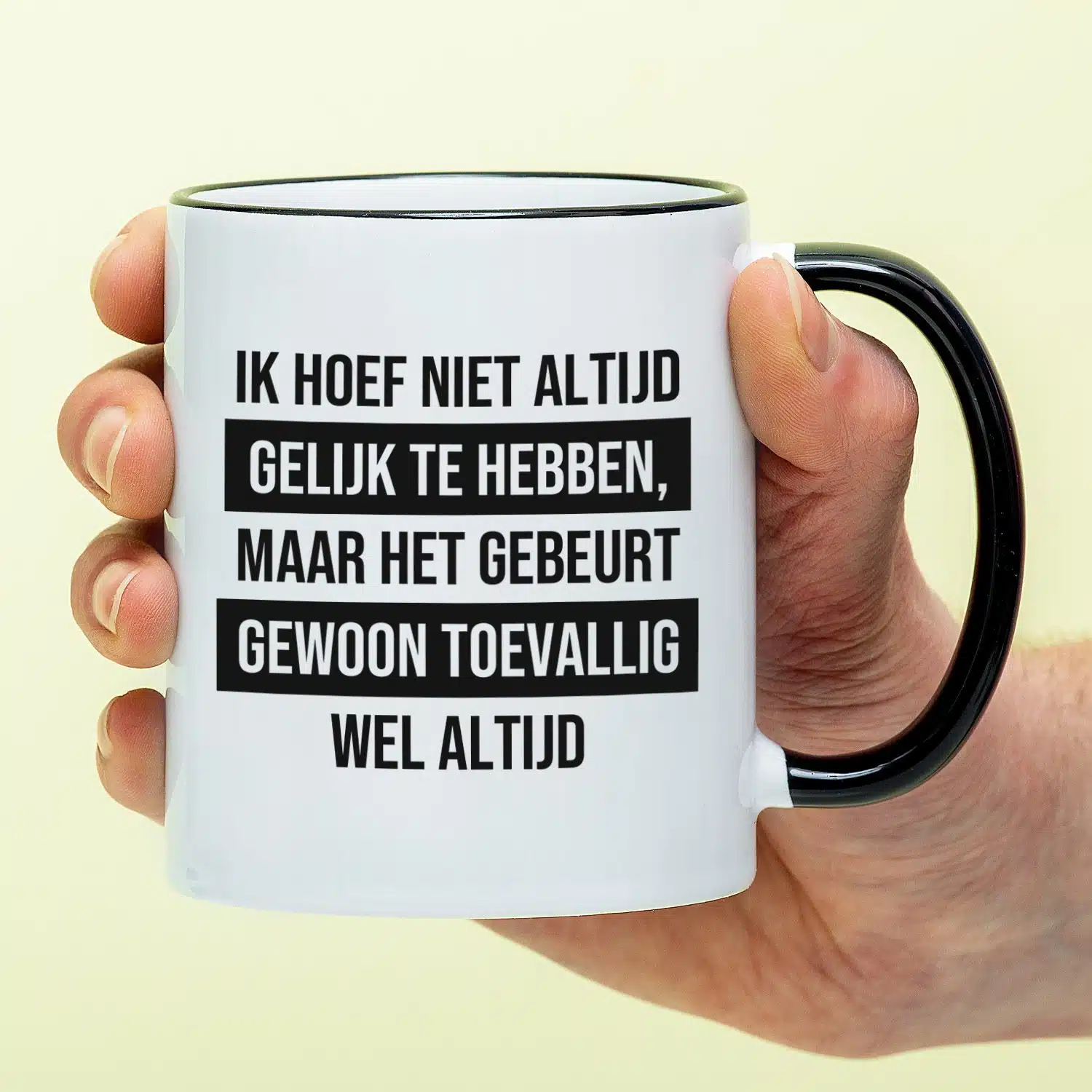 Altijd gelijk hebben is bijna onmogelijk. Behalve voor jou! Jij hebt toevallig altijd gelijk, zelfs als je vrienden, collega’s of familie dat niet wil toegeven. De Mok Ik hoef niet altijd gelijk te hebben is daar het bewijs van. Op de beker staat de tekst: Ik hoef niet altijd gelijk te hebben, maar het gebeurt gewoon toevallig wel altijd. Een grappige mok om cadeau te geven aan betweters en andere koppige types.