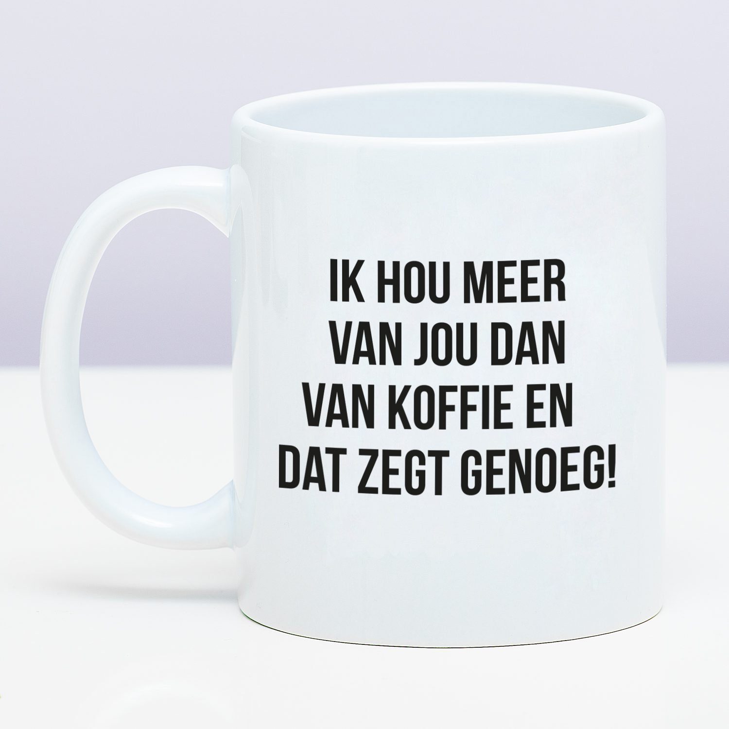 Jij bent dól op koffie. Heel erg dol op koffie. En toch is er één ding waar je nog meer van houdt en dat is je partner! Verras hem of haar met de Mok Ik hou meer van jou dan van koffie. Natuurlijk weet je lief hoe dol je op koffie bent, dus deze mok is hartverwarmend. Op de beker staat de tekst: Ik hou meer van jou dan van koffie en dat zegt genoeg!.