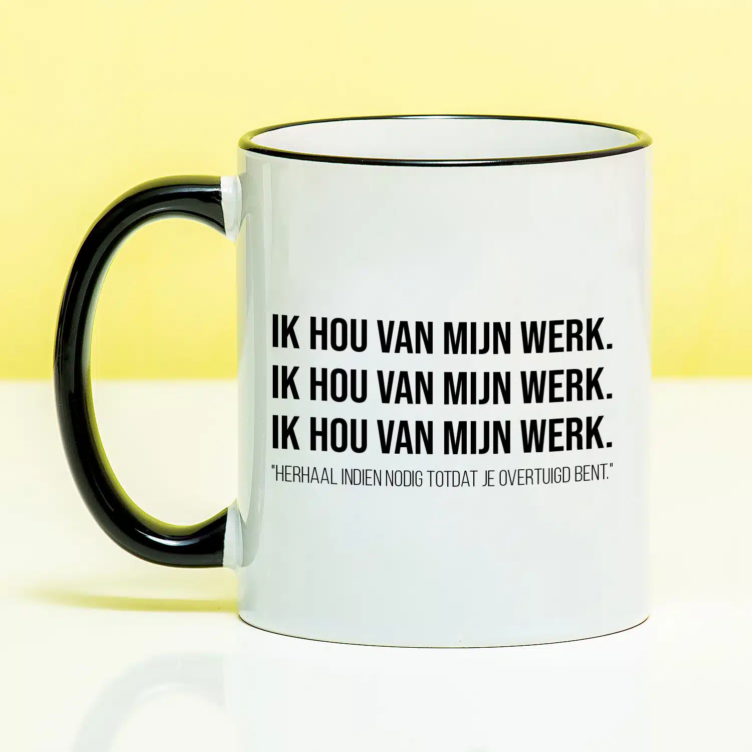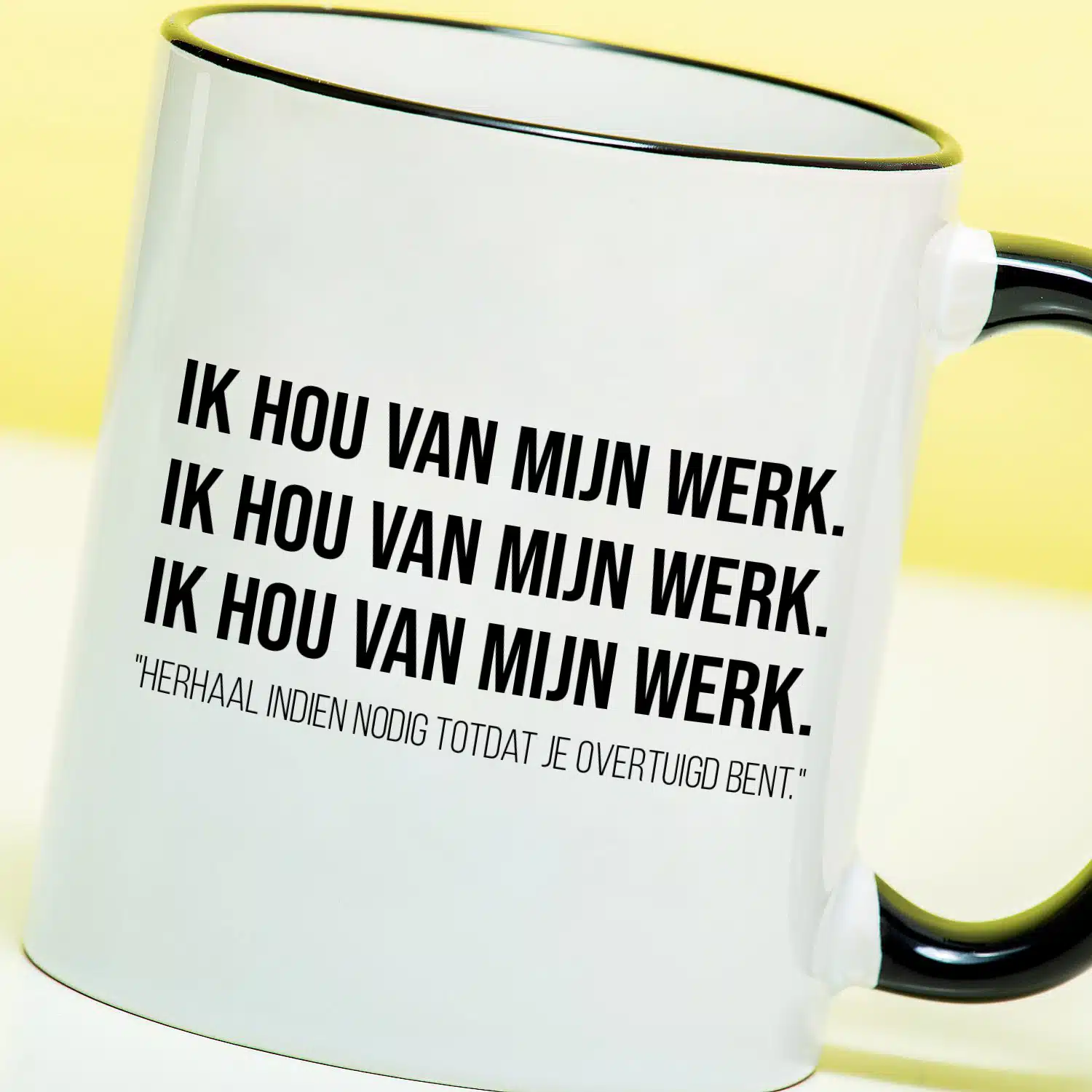 - Grappige mok met tekst: Ik hou van mijn werk (herhaal indien nodig)