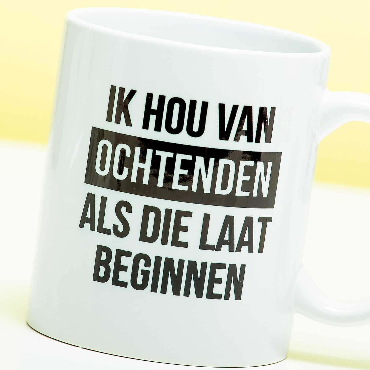 Jij bent dol op ochtenden. Op zaterdagochtend sta je altijd vroeg op bijvoorbeeld, om het meeste uit je dag te halen. De wekker gaat dan al om elf uur. Ja, jij bent een echt ochtendmens. Vervolgens drink je een kop koffie uit de Mok Ik hou van ochtenden als die laat beginnen. Een grappige mok, die je hebt gekregen van een vriend die jou heel goed kent.