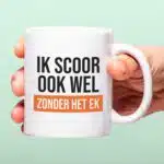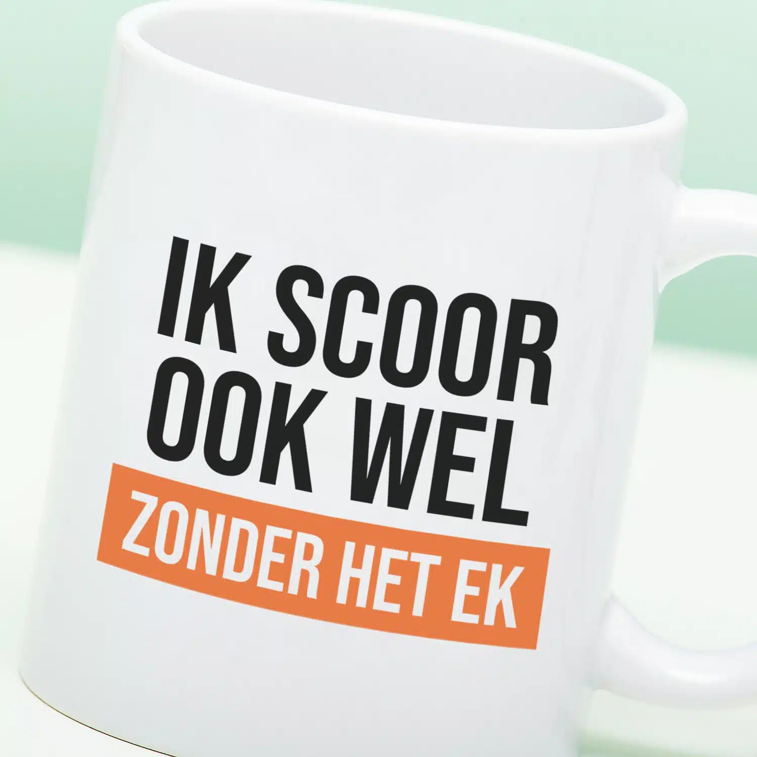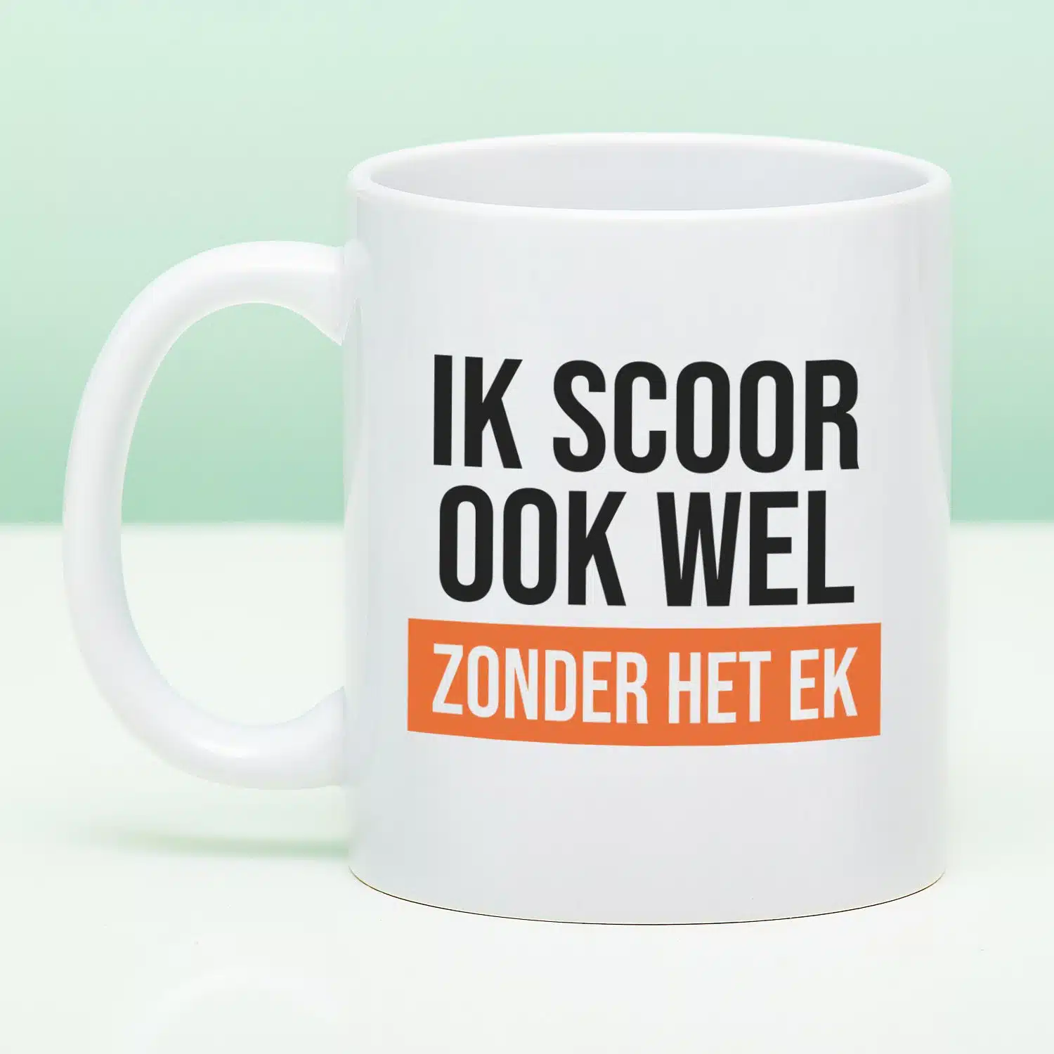 Jij kijkt graag voetbal én hebt een gezonde portie zelfvertrouwen. Je hebt dus helemaal geen EK nodig om te scoren! De grappige Mok Ik scoor ook wel zonder het EK bevat precies die tekst. Leuke mok om te gebruiken op het werk tijdens het EK of om cadeau te geven aan je tikkeltje arrogante huisgenoot.