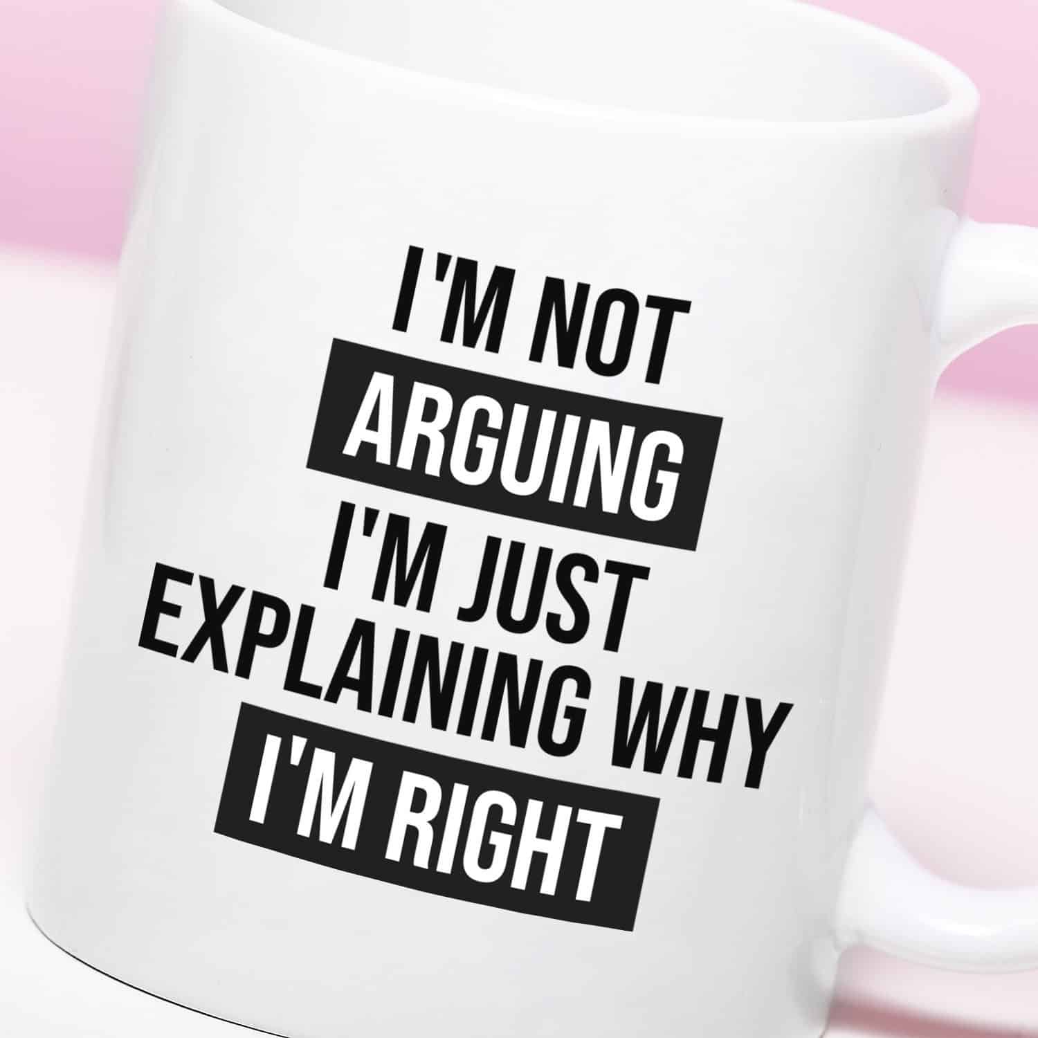 Koppig? Eigenwijs? Ruzie aan het zoeken? Welnee! Jij wilt gewoon uitleggen waarom je gelijk hebt. De Mok I’m Not Arguing is er voor iedereen die regelmatig het verwijt krijgt dat hij of zij te venijnig is en makkelijk ruzie zoekt. De tekst op de beker legt het precies uit: I’m not arguing, I’m just explaining why I’m right. Oftewel: ik maak geen ruzie, ik leg gewoon uit waarom ik gelijk heb.