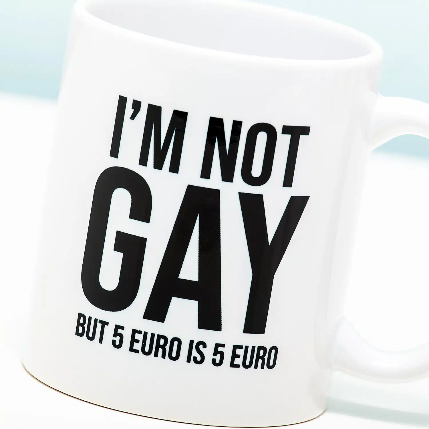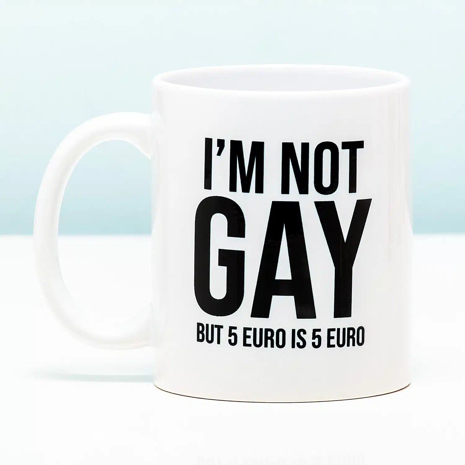 De ‘I’m not gay, but 5 euro is 5 euro’ meme is een meme onder gays die grappen dat ze zich niet als gay identificeren, maar alles doen voor een idioot laag bedrag. De Mok I’m not gay springt in op dit grapje. Op de mok staat dan ook de tekst: I’m not gay, but 5 euro is 5 euro. Een grappig cadeautje voor je losbandige vriend.