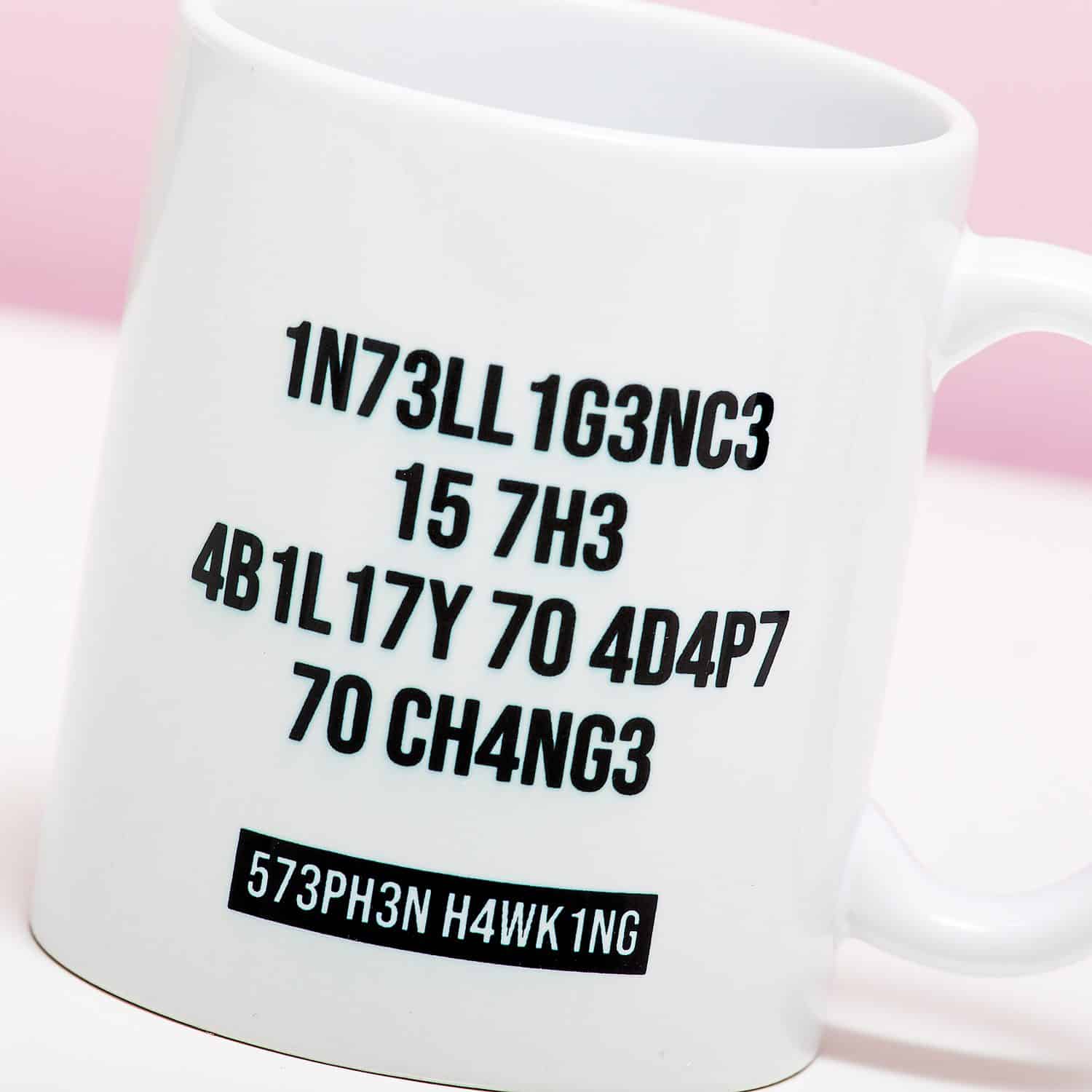 Intelligence is the ability to adapt to change is een bekende quote van de natuurkundige Stephen Hawking. Met de Mok Intelligence Is The Ability kun jij checken of je intelligent genoeg bent om verandering aan te kunnen. Op deze mok zijn sommige letters vervangen door cijfers. Kun jij het nog lezen?
