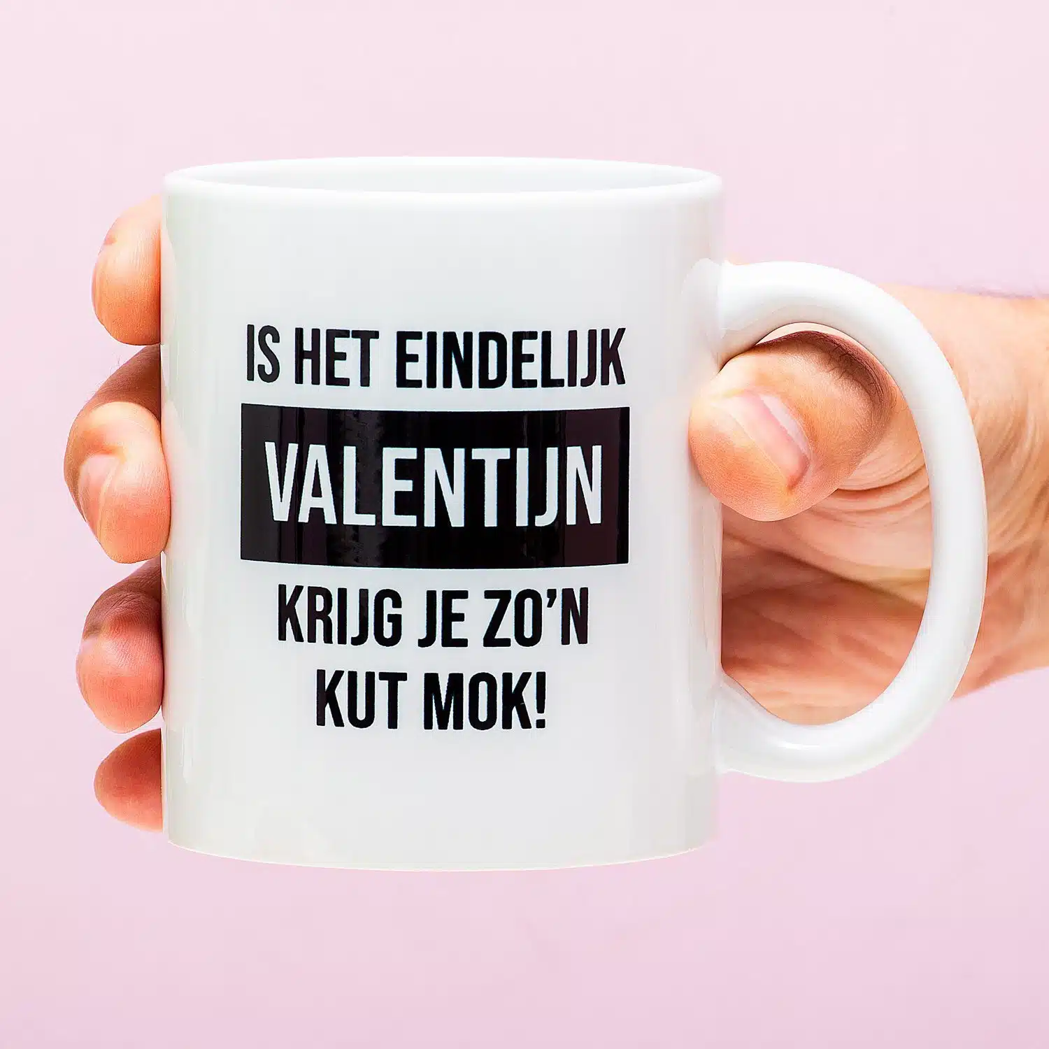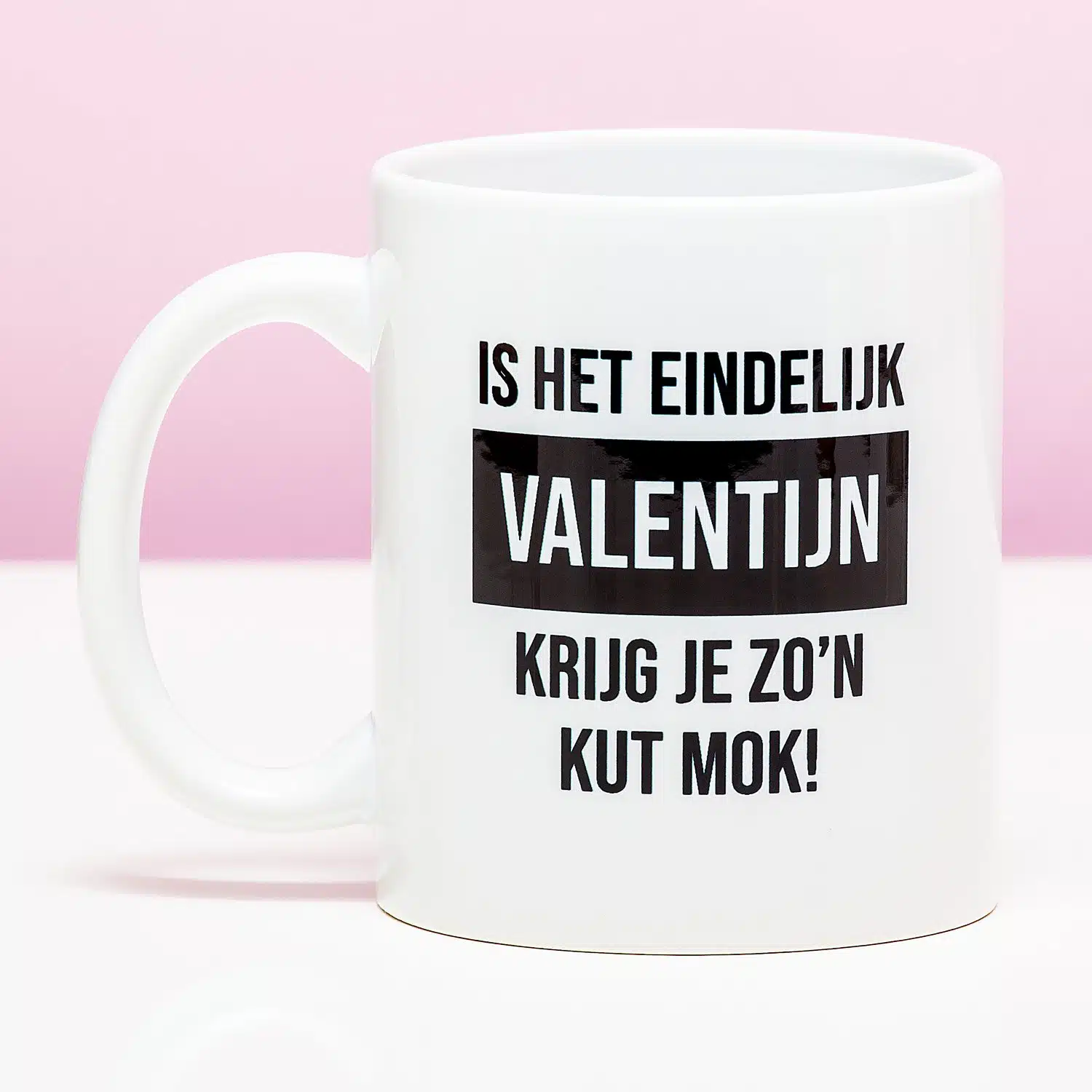 • Met de tekst: Is het eindelijk Valentijn, krijg je zo’n kut mok