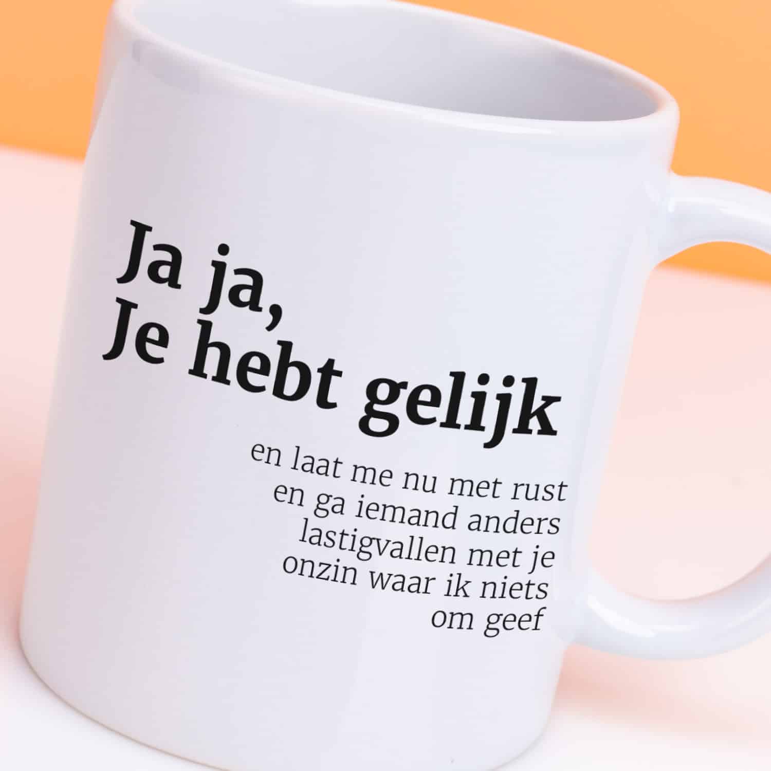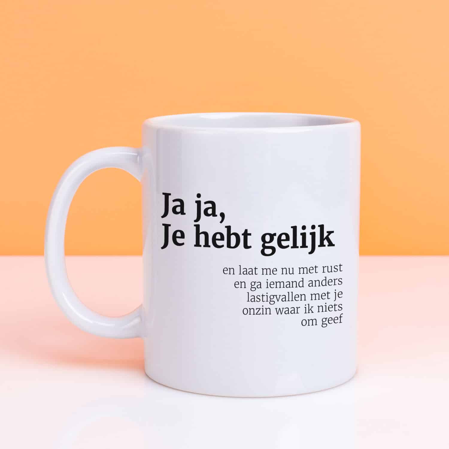 Soms is het beter om iemand gelijk te geven, zodat je geen discussie aan hoeft te gaan. Met de Mok Ja ja, je hebt gelijk hoef je het niet eens uit te spreken! Hierdoor is deze grappige beker ideaal voor bijvoorbeeld op het werk, als je een betweterige collega hebt. Op de mok staat een tekst die het duidelijk maakt dat je eigenlijk helemaal geen zin hebt om met diegene te praten. Niet zo aardig, wel duidelijk (en grappig).