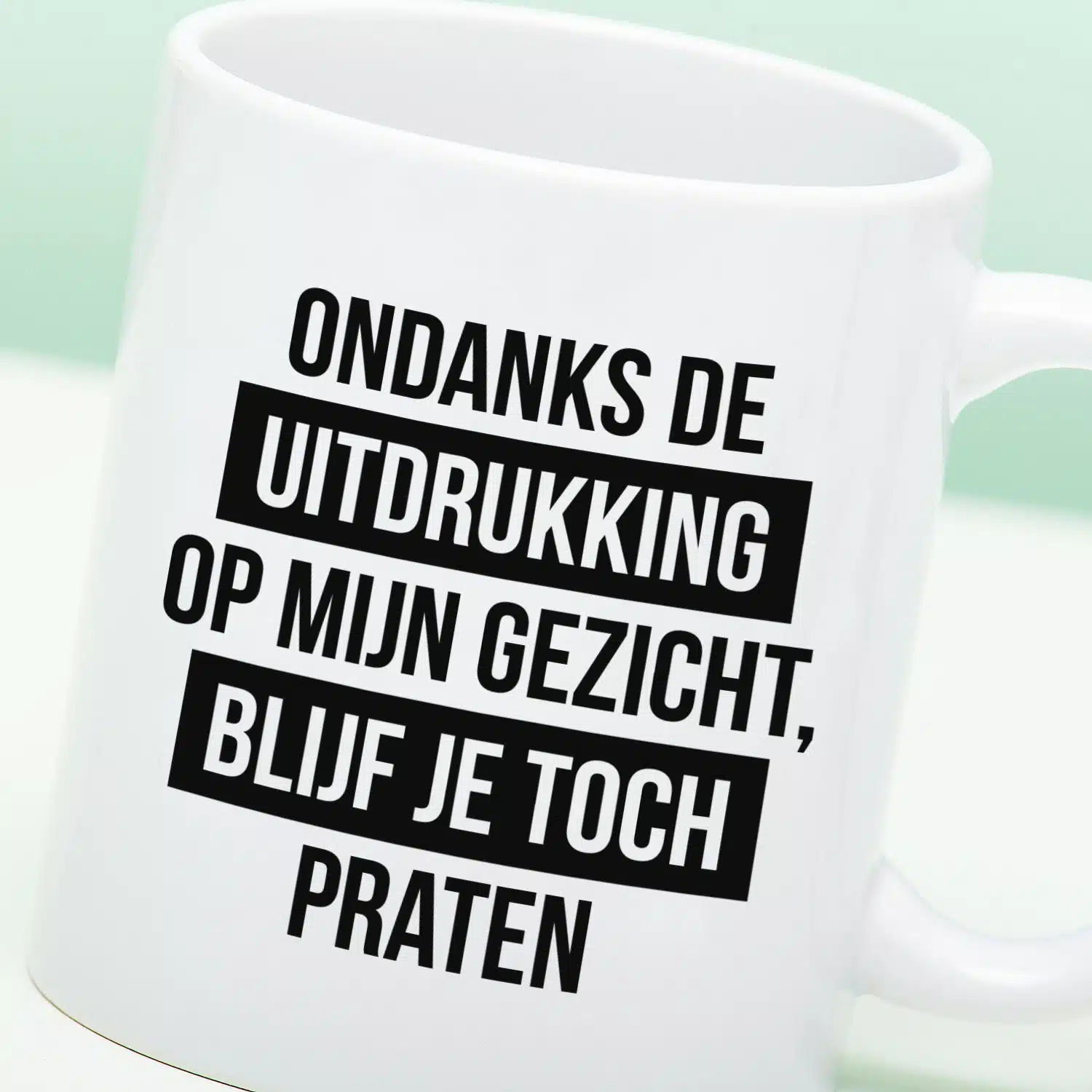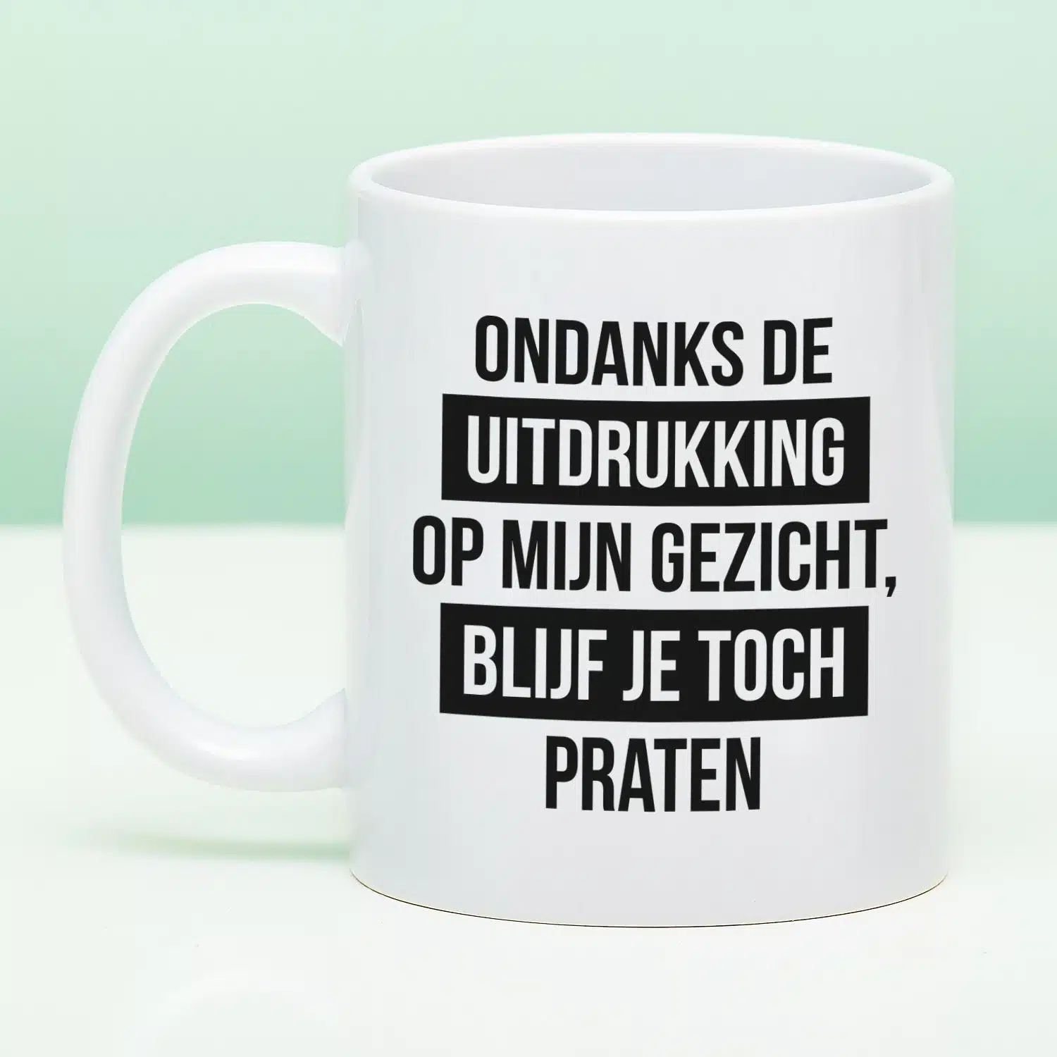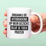 Heb je geen zin in onzinnige praatjes over het weer op het werk? Of probeer je je huisgenoten ‘s ochtends te ontlopen, omdat je dan nou eenmaal niet in de stemming bent om te kletsen? De Mok Je blijft toch praten helpt je om hier onderuit te komen. Op de mok staat de tekst: Ondanks de uitdrukking op mijn gezicht, blijf je toch praten. Iedereen die dat leest zal je óf met rust laten, óf diegene heeft een bord voor zijn kop.