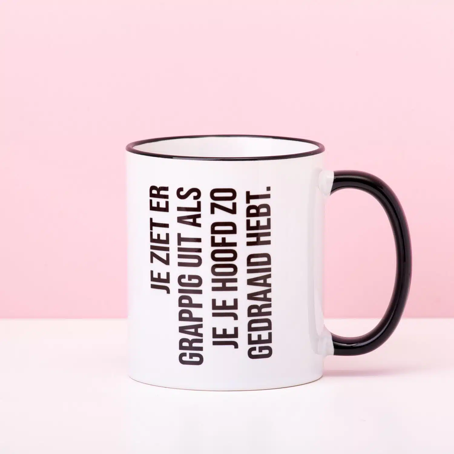 Heb je zo’n ultra nieuwsgierige collega, die je graag eens een lesje zou willen leren? Met de Mok Je ziet er grappig uit, kan dat zeker. Als je collega de beker met tekst ziet, wil ze vast graag lezen wat er staat. Maar om het makkelijker te maken, draait ze haar hoofd. De tekst is namelijk verticaal geprint. Op de mok staat de tekst: Je ziet er grappig uit, als je je hoofd zo gedraaid hebt. Misschien is ze de volgende keer minder nieuwsgierig? Ook een grappige mok om je gezin mee te verrassen aan de ontbijttafel.